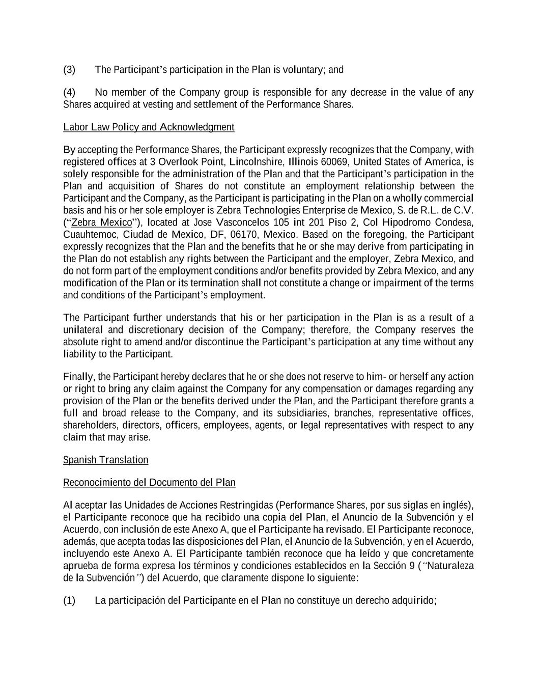 (3)参与者参与计划是自愿的;及(4)公司集团的任何成员均不对在业绩股份归属及结算时所获得的任何股份的价值减少负责。劳动法政策和认可通过接受业绩份额,参与者明确承认注册办事处位于美利坚合众国伊利诺伊州林肯郡3 Overlook Point 60069的公司全权负责该计划的管理,并且参与者参与该计划和收购股份并不构成参与者与公司之间的雇佣关系,因为参与者以完全商业基础参与该计划,其唯一雇主为斑马技术 Enterprise de Mexico,S. de R.L. de C.V.(“Zebra Mexico”),位于Jose Vasconcelos 105 int 201 Piso 2,Col Hipodromo Condesa,Cuauhtemoc,Ciudad de Mexico,DF,06170,Mexico。基于上述情况,参与者明确承认,该计划以及他或她可能从参与该计划中获得的福利并不在参与者与雇主Zebra Mexico之间确立任何权利,也不构成Zebra Mexico提供的就业条件和/或福利的一部分,并且该计划的任何修改或终止不应构成对参与者就业条款和条件的变更或损害。参与者进一步理解,他或她参与该计划是由于公司单方面和酌情决定的结果;因此,公司保留在任何时候修改和/或终止参与者参与的绝对权利,而不对参与者承担任何责任。最后,参与者在此声明,他或她本人不保留就计划的任何条款或根据计划产生的利益向公司提出任何赔偿或损害索赔的任何行动或权利,因此,参与者就可能产生的任何索赔向公司及其子公司、分支机构、代表处、股东、董事、高级职员、雇员、代理人或法定代表人授予全面和广泛的免责声明。西班牙文翻译Reconocimiento del documento del plan Al aceptar las Unidades de acciones restringidas(Performance Shares,英文缩写:por siglas en ingl é s),el Participante recococe que ha recibido una copia del Plan,el Anuncio de la Subvenci ó n y el Acuerdo,con inclusi ó n de este Anexo A,que el Participante ha revisado。此外,参与者认识到,它还接受计划的所有条款、补贴公告和协议,包括本附件A。参与者还认识到,它已阅读并具体批准了协议第9条(“补贴自然”)中规定的条款和条件,该协议明确规定了以下内容:(1)参与者参与计划不构成已获得的权利;