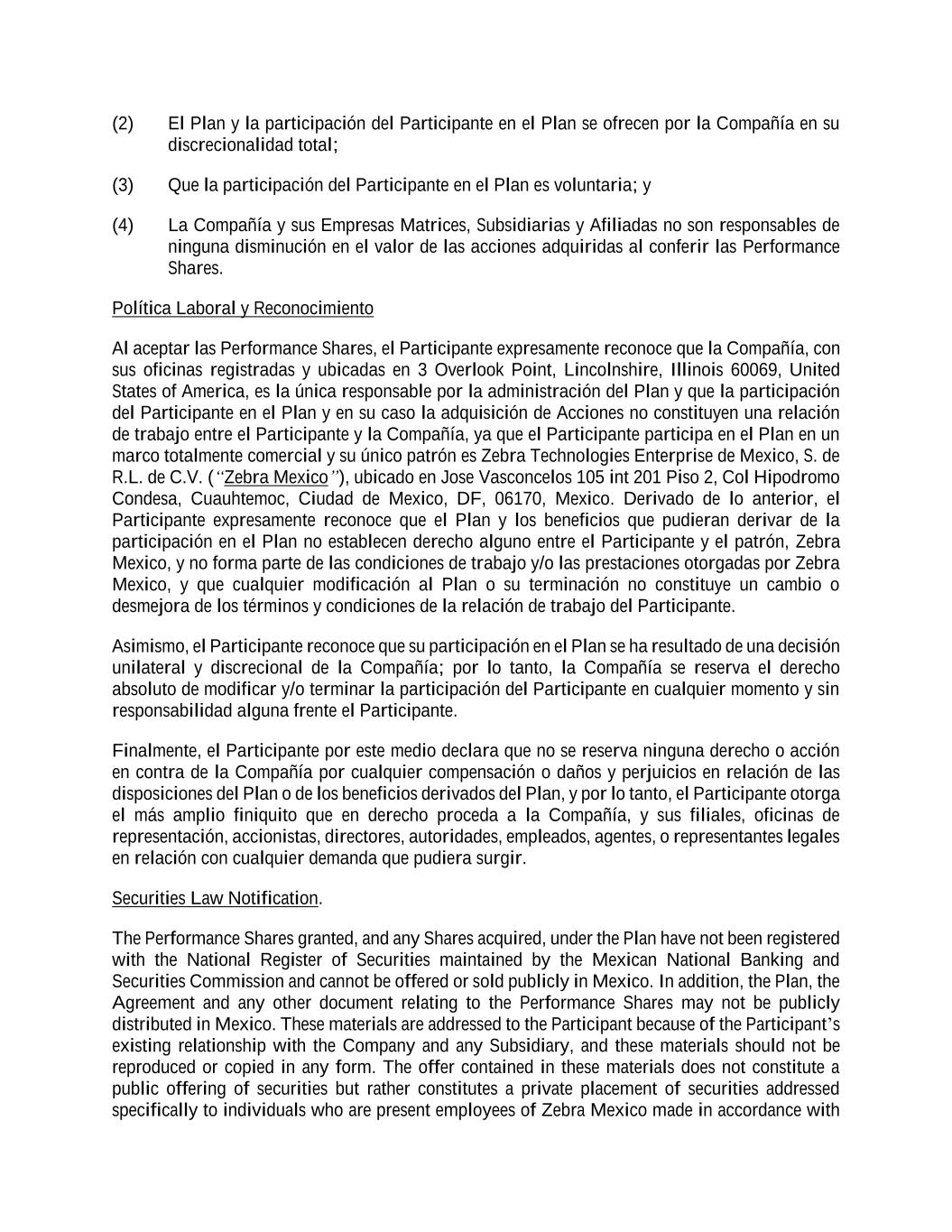 (2)El Plan y la participaci ó n del Participante en el Plan se ofrecen por la Compa ñ í a en su discrecionalidad total;(3)Que la participaci ó n del Participante en el Plan es voluntaria;y(4)la Compa ñ í a y sus Empresas Matrices,Subsidiarias y Afiliadas no son responsables de ninguna disminuci ó n en el valor de las acciones adquiridas al conferir las Performance Shares。POL í tica Laboral y Reconocimiento Al aceptar las Performance Shares,el Participante expressamente reconoce que la Compa ñ í a,con sus oficinas registradas y ubicadas en 3 Overlook Point,Lincolnshire,Illinois 60069,United States of America,es la ú nica responsable por la administraci ó n del Plan y que la participaci ó n del Participante en el Plan y en su caso la adquisici ó n de Acciones no constituyen una relaci ó n de trabajo entre el Participante y la CompaS. de R.L. de C.V.(“Zebra Mexico”),ubicado en Jose Vasconcelos 105 int 201 Piso 2,Col Hipodromo Condesa,Cuauhtemoc,Ciudad de Mexico,DF,06170,Mexico。Derivado de lo anterior,el Participante expressamente recognoce that el Plan y los beneficios que pudieran derivar de la participaci ó n en el Plan does not establecen derecho alguno entre el Participante y el patr ó n,Zebra Mexico,y no forma parte de las condiciones de trabajo y/o las prestaciones otorgadas por Zebra Mexico,y que cualquier modificaci ó n al Plan o su terminaci ó n no constitute un cambio o desmejora de los t é rminos y condiciones deAsimismo,el Participante recoces that su participaci ó n in el Plan se ha resultado de una decision sunarily y discrecional de la Compa ñ í a;por lo tanto,la Compa ñ í a se reserva el derecho absoluto de modificar y/o terminar la participaci ó n del Participante en cualquier momento y sin responsabilidad alguna front el Participante。Finalmente,el Participante por este medio declares that no se reserva ninguna derecho o acci ó n en contra de la Compa ñ í a por cualquier compensaci ó n o da ñ os y perjuicios en relaci ó n de las disposiciones del Plan o de los benefits derivados del Plan,y por lo tanto,el Participante otorga el m á s amplio finiquito que en derecho proceda a a la Compa ñ í a,y sus filiales,officinas de representaci ó n,accionistas,directors,authoridades证券法通告。根据该计划授予的业绩股份以及获得的任何股份尚未在墨西哥国家银行和证券委员会维护的国家证券登记册中登记,因此不能在墨西哥公开发售或出售。此外,该计划、该协议及任何其他有关履约股份的文件不得在墨西哥公开分发。这些材料是由于参与者与公司和任何子公司的现有关系而发给参与者的,这些材料不应以任何形式复制或复制。这些材料中包含的要约并不构成公开发行证券,而是构成根据Zebra Mexico根据