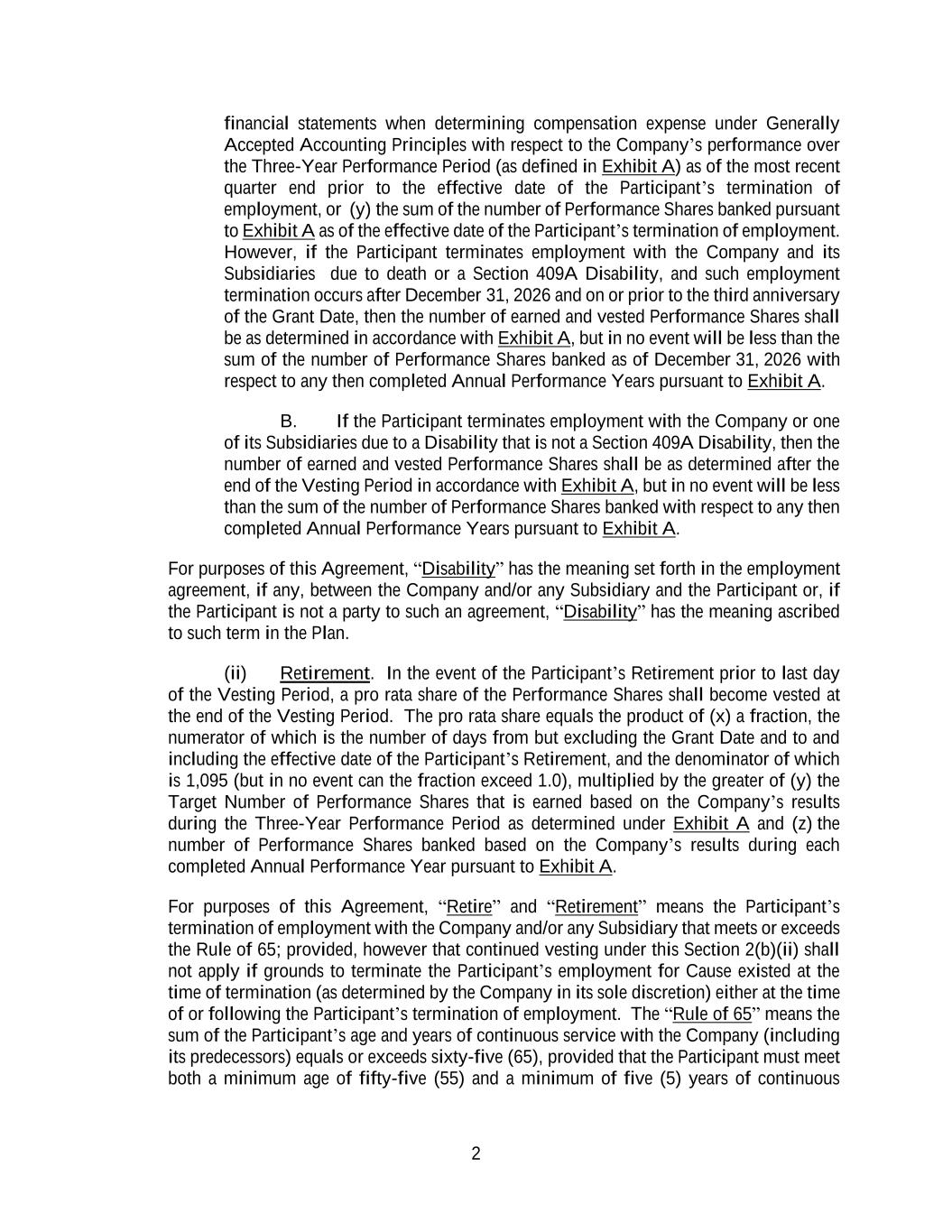 2财务报表,用于根据公认会计原则确定截至参与者终止雇佣生效日期之前的最近一个季度末公司在三年业绩期(定义见附件 A)内的业绩的补偿费用,或(y)截至参与者终止雇佣生效日期根据附件 A存入银行的业绩份额数量之和。但是,如果参与者因死亡或第409A条残疾而终止与公司及其子公司的雇佣关系,并且该雇佣关系终止发生在2026年12月31日之后且在授予日的第三个周年日或之前,则已赚取和已归属的绩效份额的数量应根据附件 A确定,但在任何情况下均不低于截至12月31日已存入银行的绩效份额数量之和,2026年,就任何当时根据附件 A. B.已完成的年度业绩年度而言,如果参与者因不属于第409A条残疾的残疾而终止与公司或其子公司之一的雇佣关系,则所赚取和归属的业绩份额的数量应在授予期结束后根据附件 A确定,但在任何情况下均不会低于任何当时根据附件 A已完成的年度业绩年度的业绩份额数量之和,就本协议而言,“残疾”具有公司和/或任何子公司与参与者之间的雇佣协议(如有)中规定的含义,或者,如果参与者不是此类协议的一方,则“残疾”具有计划中该术语的含义。(二)退休。若参与者在授予期的最后一天之前退休,则应在授予期结束时按比例归属业绩股份。按比例份额等于(x)个分数的乘积,其分子为自但不包括授予日起至参与者退休生效日止(包括在内)的天数,分母为1,095(但在任何情况下该分数都不能超过1.0),乘以(y)根据附件 A所确定的三年业绩期间的公司业绩所赚取的业绩份额的目标数量和(z)根据附件 A在每个已完成的年度业绩年度内根据公司业绩存入银行的业绩份额数量(以较大者为准),就本协议而言,“退休”和“退休”是指参与者终止与公司和/或任何子公司的雇佣关系,达到或超过了第65条规则;前提是,然而,如果在终止时(由公司全权酌情决定)在参与者终止雇佣时或之后存在因故终止参与者雇佣的理由,则根据本条第2(b)(ii)款继续归属不适用。“65岁规则”是指参与者的年龄和在公司(包括其前任)连续服务的年限之和等于或超过六十五岁(65岁),前提是参与者必须同时满足五十五岁(55岁)的最低年龄和五(5)年的连续