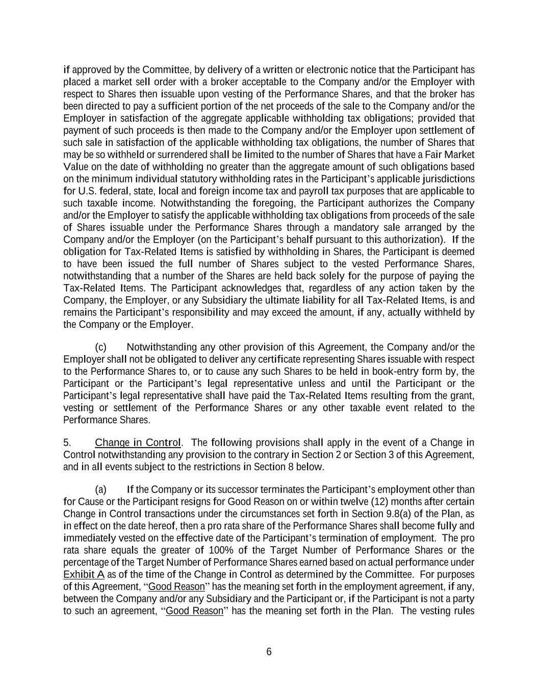 6如果委员会批准,通过交付书面或电子通知,表明参与者已就业绩股份归属时当时可发行的股份向公司和/或雇主可接受的经纪人下达了市场卖单,且已指示经纪人向公司和/或雇主支付足够部分的出售净收益,以清偿适用的预扣税义务总额;但前提是此类收益随后在此类出售结算时向公司和/或雇主支付,以清偿适用的预扣税义务,可如此代扣代缴或交还的股份数量应限于在代扣代缴之日具有公允市场价值的股份数量,该数量不超过根据参与者适用的美国联邦、州、地方和外国所得税和工资税目的适用于此类应税收入的最低个人法定预扣税率计算的此类债务总额。尽管有上述规定,参与者授权公司和/或雇主通过公司和/或雇主(根据本授权代表参与者)安排的强制性出售,从根据业绩股份发行的股份的出售收益中履行适用的预扣税义务。如果通过代扣代缴股份来履行与税务有关的项目的义务,则参与者被视为已获得全部数量的受既得业绩股份约束的股份,尽管若干股份仅为支付与税务有关的项目而被扣留。参与者承认,无论公司、雇主或任何子公司采取任何行动,所有与税务相关的项目的最终责任都是并且仍然是参与者的责任,并且可能超过公司或雇主实际扣留的金额(如果有的话)。(c)尽管有本协议的任何其他规定,公司和/或雇主没有义务向参与者或参与者的法定代表人交付任何代表就履约股份可发行的股份的证书,或促使参与者或参与者的法定代表人以记账形式持有任何此类股份,除非且直至参与者或参与者的法定代表人已支付因履约股份的授予、归属或结算或与履约股份相关的任何其他应税事件而产生的与税收相关的项目。5.控制权变更。即使本协议第2节或第3节有任何相反规定,在控制权发生变更的情况下,以及在受以下第8节限制的所有情况下,应适用以下规定。(a)如公司或其继任人在计划第9.8(a)条所列情况下的控制权交易发生某些变更后的十二(12)个月或之后的十二(12)个月内非因故终止参与者的雇佣或参与者因正当理由辞职,如在本计划日期生效,则绩效股份的按比例份额应于参与者终止雇佣的生效日期成为全部并立即归属。按比例分配的份额等于业绩份额目标数量的100%或基于截至委员会确定的控制权变更时的附件 A下的实际业绩而赚取的业绩份额目标数量的百分比中的较高者。就本协议而言,“良好理由”具有公司和/或任何子公司与参与者之间的雇佣协议(如有)中规定的含义,如果参与者不是此类协议的一方,则“良好理由”具有计划中规定的含义。归属规则