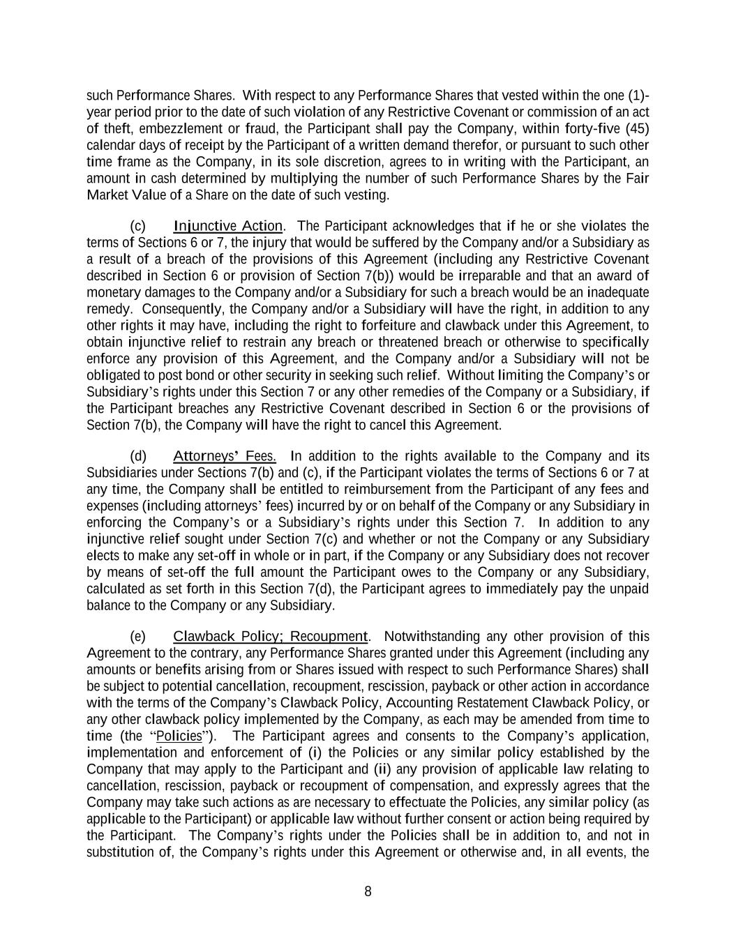 8只此类业绩股。就在违反任何限制性公约或实施盗窃、贪污或欺诈行为的日期前一(1)年期间内归属的任何履约股份而言,参与者应在参与者收到有关的书面要求后的四十五(45)个日历日内,或根据公司全权酌情与参与者书面同意的其他时间范围,向公司支付,以现金形式确定的金额,该金额由该等履约股份的数量乘以股份在该归属日期的公允市场价值确定。(c)禁令行动。参与者承认,如果他或她违反第6或7条的条款,公司和/或子公司因违反本协议条款(包括第6条或第7(b)条条款中所述的任何限制性公约)而遭受的损害将是不可弥补的,并且就此类违约向公司和/或子公司判给金钱损害赔偿将是不充分的补救措施。因此,公司及/或附属公司除根据本协议可能拥有的任何其他权利(包括没收及追回权利)外,将有权获得禁令救济以约束任何违约或威胁违约或以其他方式具体强制执行本协议的任何条款,而公司及/或附属公司将无义务在寻求此类救济时提供保证金或其他担保。在不限制公司或附属公司根据本条第7款所享有的权利或公司或附属公司的任何其他补救措施的情况下,如参与者违反第6条所述的任何限制性契约或第7(b)条的规定,公司将有权取消本协议。(d)律师费。除公司及其附属公司根据第7(b)及(c)条可享有的权利外,如参与者在任何时间违反第6或7条的条款,公司有权向参与者偿付公司或任何附属公司或其代表在执行公司或附属公司根据本条第7条享有的权利时所招致的任何费用及开支(包括律师费)。除了根据第7(c)条寻求的任何强制性救济以及无论公司或任何附属公司是否选择全部或部分作出任何抵销外,如果公司或任何附属公司未能通过抵销参与者欠公司或任何附属公司的全部金额(按本条第7(d)条规定计算)的方式收回,参与者同意立即向公司或任何附属公司支付未付余额。(e)追回政策;补偿。尽管本协议另有相反规定,根据本协议授予的任何履约股份(包括因该等履约股份而产生的任何金额或利益或就该等履约股份发行的股份)须根据公司的追回政策、会计重述追回政策或公司实施的任何其他追回政策的条款进行潜在的注销、补偿、撤销、偿还或其他行动,每项政策均可不时修订(“政策”)。参与者同意并同意公司适用、实施和执行(i)公司制定的可能适用于参与者的政策或任何类似政策以及(ii)与取消、撤销、偿还或补偿有关的适用法律的任何规定,并明确同意公司可采取必要的行动以实施政策、任何类似政策(如适用于参与者)或适用法律,而无需参与者进一步同意或采取行动。公司在政策下的权利应是公司在本协议或其他协议下的权利的补充,而不是替代,并且在所有情况下,