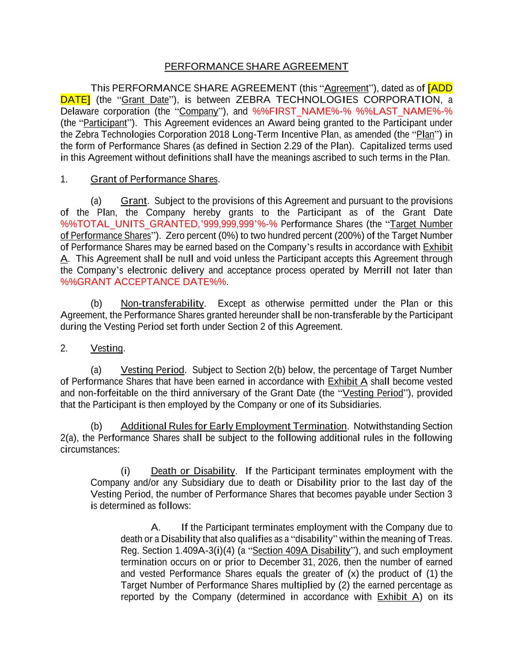 业绩份额协议本业绩份额协议(本“协议”),日期为[添加日期](“授予日”),由特拉华州公司ZEBRA TECHNOLOGIES CORPORATION(“公司”)与%% FIRST _ NAME %-%%% LAST _ NAME %-%(“参与者”)签署。本协议证明根据经修订的Zebra Technologies Corporation 2018年长期激励计划(“计划”)以业绩份额(定义见计划第2.29节)的形式授予参与者的奖励。本协议中使用的没有定义的大写术语应具有计划中赋予此类术语的含义。1.授予业绩股份。(a)赠款。在符合本协议规定的情况下,根据计划的规定,公司特此向参与者授予截至授予日期%% TOTAL _ UNITS _ GRANTED,‘999,999,999’%-%业绩股份(“业绩股份的目标数量”)。业绩份额目标数量的百分之零(0%)至百分之二百(200%)可以根据公司根据附件 A的业绩赚取,本协议无效,除非参与人不迟于%%授予接受日%%通过公司由Merrill操作的电子交付和验收流程接受本协议。(b)不可转让性。除本计划或本协议另有许可外,根据本协议授予的业绩份额在本协议第2节规定的授予期期间内不得由参与者转让。2.归属。(甲)授予期。在符合下文第2(b)节的规定下,已根据附件 A赚取的业绩股份目标数目的百分比将于授予日的第三个周年日(“授予期”)成为归属及不可没收,前提是该参与者随后受雇于公司或其一家子公司。(b)提前终止雇用的附加规则。尽管有第2(a)条的规定,在以下情况下,业绩份额应受以下附加规则的约束:(i)死亡或残疾。如果参与者在授予期的最后一天之前因死亡或残疾而终止与公司和/或任何子公司的雇佣关系,则根据第3条成为应付的业绩份额的数量确定如下:A.如果参与者因死亡或残疾而终止与公司的雇佣关系,该残疾也符合Treas含义内的“残疾”。Reg.Section 1.409A-3(i)(4)(a“第409A条残疾”),且该雇佣关系终止发生在2026年12月31日或之前,那么已赚取和已归属的业绩份额的数量等于(x)(1)业绩份额的目标数量乘以(2)公司报告的已赚取百分比(根据附件 A确定)的乘积中的较大者