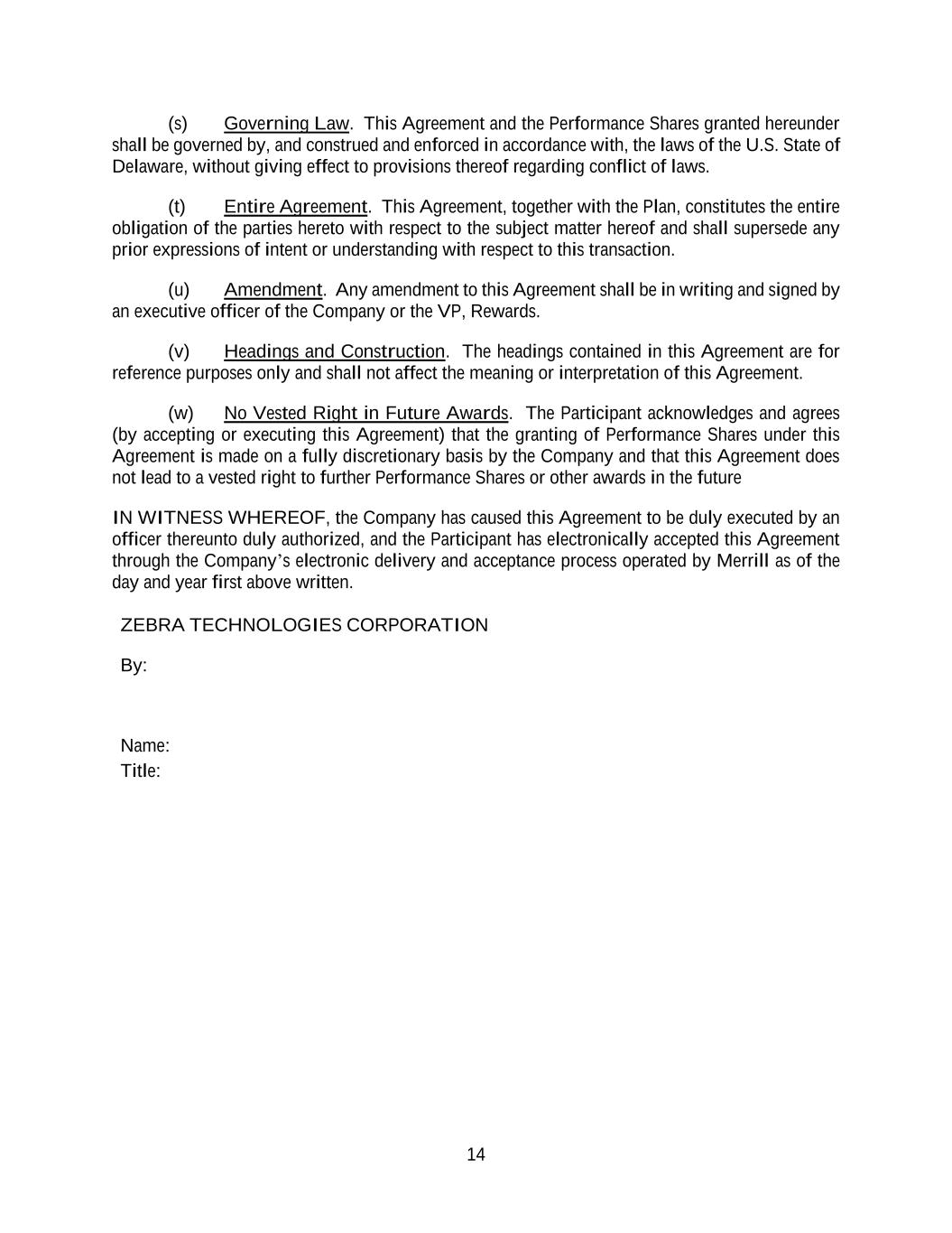 14(s)管辖法律。本协议和根据本协议授予的履约份额应受美国特拉华州法律管辖,并根据其解释和执行,而不使其有关法律冲突的条款生效。(t)全部协议。本协议连同本计划构成本协议各方就本协议标的事项承担的全部义务,并应取代任何先前就本次交易表达的意向或谅解。(u)修正案。本协议的任何修订应以书面形式提出,并由公司执行官或副总裁Rewards签署。(五)标题和施工。本协议中包含的标题仅供参考,不影响本协议的含义或解释。(w)在未来的奖励中没有既得权利。参与者承认并同意(通过接受或执行本协议),本协议项下的履约股份的授予由公司全权酌情作出,并且本协议不会导致在未来以证人身份进一步履约股份或其他奖励的既得权利,公司已促使本协议由一名获得正式授权的高级人员正式执行,并且参与者已通过公司截至上述日期和年份首次书面的美林操作的电子交付和接受流程以电子方式接受本协议。ZEBRA TECHNOLOGIES CORPORATION by:Name:Title: