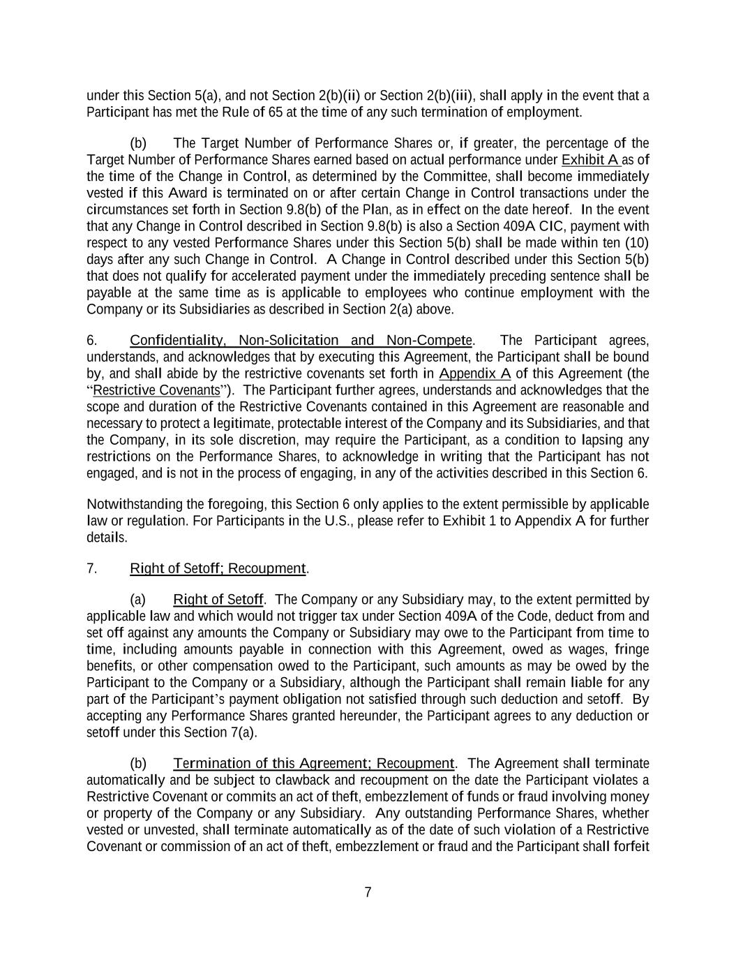 根据本条第5(a)条而非第2(b)(ii)或第2(b)(iii)条,第7条适用于任何参与者在任何该等终止雇用时已符合第65条规则的情况。(b)如果本奖励在计划第9.8(b)节所述情况下的控制权交易发生某些变化时或之后终止,则绩效股份的目标数量或(如更多)根据委员会确定的截至控制权变更时的附件 A项下的实际表现所赚取的绩效股份目标数量的百分比应立即归属,如在本计划当日生效。如果第9.8(b)节所述的任何控制权变更也属于第409A节中投,则应在任何此类控制权变更后的十(10)天内支付根据第5(b)节规定的任何既得业绩股份。本第5(b)节所述的控制权变更,如不符合上一句所述的加速付款条件,应在适用于上文第2(a)节所述的继续受雇于公司或其子公司的雇员的同时支付。6.保密、不招揽、不竞争。参与者同意、理解并承认,通过执行本协议,参与者应受本协议附录A中规定的限制性约定(“限制性约定”)的约束,并应遵守这些约定。参与者进一步同意、理解并承认,本协议所载限制性契约的范围和期限是合理和必要的,以保护公司及其子公司的合法、可保护的利益,并且公司可全权酌情要求参与者(作为对业绩股份的任何限制失效的条件)以书面形式承认参与者没有参与,也没有在参与过程中参与本第6节所述的任何活动。尽管有上述规定,本条第6款仅在适用法律或条例允许的范围内适用。对于美国的参与者,请参阅附录A的附件 1了解更多详情。7.抵销权;追偿权。(a)抵销权。公司或任何附属公司可在适用法律许可且不会根据《守则》第409A条触发征税的范围内,从公司或附属公司可能不时欠参与者的任何款项中扣除并抵销,包括与本协议有关的应付款项,作为欠参与者的工资、附加福利或其他补偿而欠参与者的款项,例如参与者可能欠公司或附属公司的款项,虽然参与者仍须对参与者的任何部分付款义务未能通过该等扣除及抵销而承担责任。通过接受根据本协议授予的任何绩效份额,参与者同意根据本条第7(a)款进行任何扣除或抵销。(b)本协议的终止;补偿。协议应自动终止,并在参与者违反限制性契约或实施涉及公司或任何子公司的金钱或财产的盗窃、挪用资金或欺诈行为之日进行追回和补偿。任何已发行的业绩股份,不论已归属或未归属,自违反限制性契约或实施盗窃、贪污或欺诈行为之日起自动终止,参与者将被没收