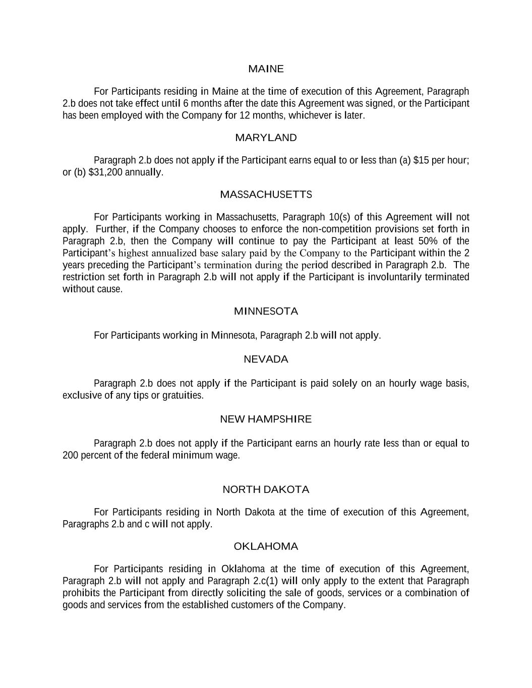 MAINE对于本协议执行时居住在缅因州的参与者,第2.b款直到本协议签署之日起6个月后才生效,或参与者已在公司受雇12个月,以较晚者为准。如果参加者的收入等于或低于(a)每小时15美元;或(b)每年31200美元,则马里兰州第2.b款不适用。马萨诸塞州对于在马萨诸塞州工作的参与者,本协议第10(s)段将不适用。此外,如果公司选择执行第2.b款规定的竞业禁止条款,那么公司将继续向参与者支付至少50%的参与者在第2.b款所述期间内公司在参与者终止之前的2年内支付给参与者的最高年化基本工资。2.b款规定的限制,如果参与者无故被非自愿终止,则不适用。MINNESOTA对于在明尼苏达州工作的参与者,第2.b段将不适用。NEVADA第2.b款不适用于仅按小时工资支付参与者的情况,不包括任何小费或酬金。如果参与者的时薪低于或等于联邦最低工资的200%,则新汉普郡第2.b款不适用。北达科他州对于本协议执行时居住在北达科他州的参与者,第2.b和c款将不适用。OKLAHOMA对于本协议执行时居住在俄克拉何马州的参与者,第2.b款将不适用,第2.c(1)款将仅在该款禁止参与者直接向公司的既定客户招揽商品、服务或商品和服务的组合销售的情况下适用。