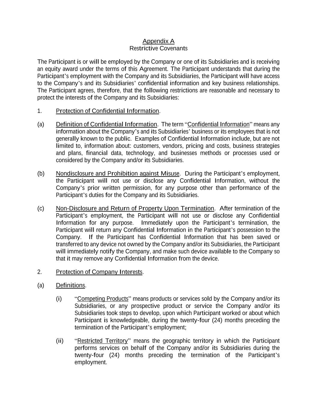 附录A限制性契约参与者目前或将受雇于公司或其子公司之一,并正在根据本协议的条款获得股权奖励。参与者了解,在参与者受雇于公司及其子公司期间,参与者将可以访问公司及其子公司的机密信息和关键业务关系。因此,参与者同意,为保护公司及其子公司的利益,以下限制是合理和必要的:1。保护机密信息。(a)机密信息的定义。保密资料一词是指有关公司及其附属公司的业务或其雇员的任何一般不为公众所知的资料。机密信息的例子包括但不限于有关以下方面的信息:客户、供应商、定价和成本、业务战略和计划、财务数据、技术以及公司和/或其子公司使用或考虑的业务方法或流程。(b)不披露和禁止滥用。在参与者受雇期间,未经公司事先书面许可,参与者将不会出于除为公司及其子公司履行参与者职责以外的任何目的使用或披露任何机密信息。(c)终止时不披露和返还财产。在终止参与者的雇佣后,参与者将不会出于任何目的使用或披露任何机密信息。在参与者终止后,参与者将立即将参与者拥有的任何机密信息退还公司。如果参与者有已保存或转移到任何非公司和/或其子公司拥有的设备的机密信息,参与者将立即通知公司,并向公司提供该设备,以便其可以从设备中删除任何机密信息。2.保护公司利益。(a)定义。(i)“竞争产品”指公司和/或其子公司销售的产品或服务,或公司和/或其子公司采取步骤开发的任何预期产品或服务,参与者在其受雇终止前的二十四(24)个月内工作或参与者了解的产品或服务;(ii)“受限区域”指参与者在其受雇终止前的二十四(24)个月内代表公司和/或其子公司提供服务的地理区域。