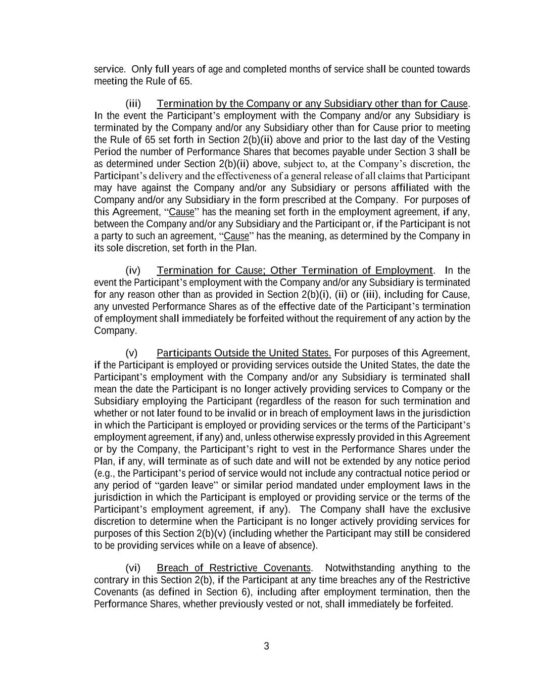 3服务。只有满周岁和服务满月数才算符合65规则。(iii)由公司或任何非因故附属公司终止。倘参与者在符合上文第2(b)(ii)条所载的第65条规则之前及在授予期的最后一天之前被公司及/或任何附属公司非因故终止于公司及/或任何附属公司的雇佣,则根据第3条须支付的履约股份数目须按根据上文第2(b)(ii)条厘定,但须由公司酌情决定,参与者的交付以及参与者可能以公司规定的形式对公司和/或任何子公司或与公司和/或任何子公司有关联的人提出的所有索赔的一般解除效力。就本协议而言,“原因”具有公司和/或任何子公司与参与者之间的雇佣协议(如有)中规定的含义,如果参与者不是此类协议的一方,则“原因”具有由公司自行酌情确定的计划中规定的含义。(四)因故终止雇佣关系;其他终止雇佣关系。如果参与者在公司和/或任何子公司的雇佣因第2(b)(i)、(ii)或(iii)条规定以外的任何原因(包括出于原因)被终止,则自参与者终止雇佣生效之日起的任何未归属业绩股份将立即被没收,而无需公司采取任何行动。(五)美国境外的参与者。就本协议而言,如参与者在美国境外受雇或提供服务,则该参与者在公司和/或任何子公司的受雇终止之日,系指该参与者不再积极向公司或雇用该参与者的子公司提供服务之日(无论该终止的原因如何,以及无论后来是否被认定为无效或违反该参与者受雇或提供服务的司法管辖区的雇佣法律或该参与者的雇佣协议条款(如有),除非本协议或公司另有明确规定,参与者根据计划归属于履约股份的权利(如有)将自该日期起终止,且不会因任何通知期而延长(例如,参与者的服务期将不包括任何合同通知期或任何“游园假”期间或参与者受雇或提供服务的司法管辖区的就业法规定的类似期间或参与者的雇佣协议条款(如有)。公司拥有专属酌情决定权,以决定参与者何时不再积极为本第2(b)(v)条的目的提供服务(包括该参与者在休假期间是否仍可被视为提供服务)。(vi)违反限制性盟约。尽管本条第2(b)条另有相反规定,如参与者在任何时间违反任何限制性契约(如第6条所界定),包括在终止雇用后,则业绩股份,不论先前是否已归属,均须立即被没收。