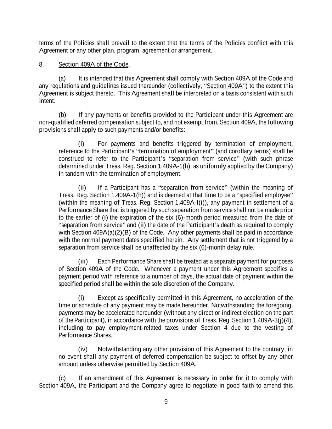 政策的9个条款与本协议或任何其他计划、方案、协议或安排发生冲突的,以政策的9个条款为准。8.守则第409a条。(a)本协议拟在本协议受其约束的范围内遵守《守则》第409A条以及根据该条发布的任何条例和准则(统称“第409A条”)。本协议应在与此意图一致的基础上加以解释。(b)如果根据本协议向参与者提供的任何付款或福利属于不符合条件的递延补偿,但须遵守且不豁免于第409A条,则以下规定应适用于此类付款和/或福利:(i)对于因终止雇用而触发的付款和福利,提及参与者的“终止雇用”(以及必然条款)应被解释为指参与者的“离职”(在Treas.Reg.第1.409A-1(h)条中确定的短语,由公司统一适用)与终止雇用同时进行。(ii)如参与者有“离职”(在Treas.Reg.第1.409A-1(h)条的含义内),且当时被视为“特定雇员”(在Treas.Reg.第1.409A-l(i)条的含义内),则由该离职触发的任何结算绩效份额的付款,不得在(i)自“离职”之日起计算的六(6)个月期限届满和(ii)参与者死亡之日中较早者之前支付,以符合《守则》第409A(a)(2)(b)条的规定。任何其他款项应按照本协议规定的正常付款日期支付。任何未因离职触发的结算,应不受六(6)个月延迟规则的影响。(iii)就《守则》第409A条而言,每一履约份额应被视为一笔单独的付款。每当本协议项下的付款参照天数指定付款期限时,在规定期限内的实际付款日期应由公司全权酌情决定。(i)除本协议特别许可外,不得根据本协议加速任何付款的时间或时间表。尽管有上述规定,根据Treas.Reg.第1.409A-3(j)(4)条的规定,可根据本协议加速付款(无需参与者进行任何直接或间接选择),包括根据第4条支付因业绩份额归属而产生的与就业相关的税款。(iv)尽管本协议另有相反规定,除非第409A条另有许可,否则在任何情况下,任何递延补偿的付款均不得被任何其他款额所抵销。(c)如为使本协议符合第409A条的规定而有必要修订本协议,则参与者与公司同意本着诚意进行磋商以修订本协议