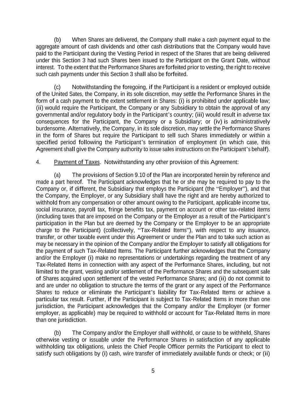 5(b)当股份交付时,公司须作出现金支付,相等于公司本应在授予期期间就根据本第3条正在交付的股份向该参与者支付的现金股息及其他现金分派的总额,倘该等股份已于授予日向该参与者发行,则不另计利息。如果履约股份在归属前被没收,则根据本条第3款收取该等现金付款的权利也将被没收。(c)尽管有上述规定,如果参与者是美国境外的居民或受雇人员,公司可全权酌情以现金支付的形式结算业绩股份,但以股份结算的范围为:(i)适用法律禁止;(ii)将要求参与者、公司或任何子公司获得参与者所在国家的任何政府和/或监管机构的批准;(iii)将导致参与者、公司或子公司的不利税务后果;或(iv)具有行政负担。或者,公司可全权酌情以股份的形式结算履约股份,但要求参与者立即或在参与者终止雇佣后的指定期限内出售该等股份(在这种情况下,本协议应授权公司代表参与者发布销售指示)。4.缴税。尽管本协议有任何其他规定:(a)计划第9.10节的规定通过引用并入本文,并成为本文的一部分。参与者承认,他或她可能被要求向公司或(如果不同)雇用参与者的子公司(“雇主”)付款,并且公司、雇主或任何子公司应有权并在此被授权从欠参与者的任何补偿或其他金额中预扣适用的所得税、社会保险、工资税、附加福利税,账款支付或其他与税收相关的项目(包括因参与者参与计划而对公司或雇主征收但公司或雇主认为是向参与者适当收费的税款)(统称“与税收相关的项目”),就本协议或计划下的任何发行、转让或其他应税事件,并采取公司和/或雇主认为必要的行动,以履行支付此类与税收相关的项目的所有义务。参与者进一步承认,公司和/或雇主(i)没有就与业绩股份的任何方面有关的任何税务相关项目的处理作出任何陈述或承诺,包括但不限于授予,业绩股份的归属和/或结算,以及在已归属业绩股份结算时获得的股份的后续出售;(ii)不承诺也没有义务构建授予条款或业绩股份的任何方面,以减少或消除参与者对税务相关项目的责任或实现特定的税务结果。此外,如果参与者在多个司法管辖区受制于与税务相关的项目,则参与者承认,公司和/或雇主(或前雇主,如适用)可能被要求在多个司法管辖区扣留或核算与税务相关的项目。(b)公司和/或雇主应扣留或安排扣留根据履约股份以其他方式归属或可发行的股份,以清偿任何适用的预扣税义务,除非首席人事官允许参与者选择通过(i)现金、电汇即时可用资金或支票来履行此类义务;或(ii)
