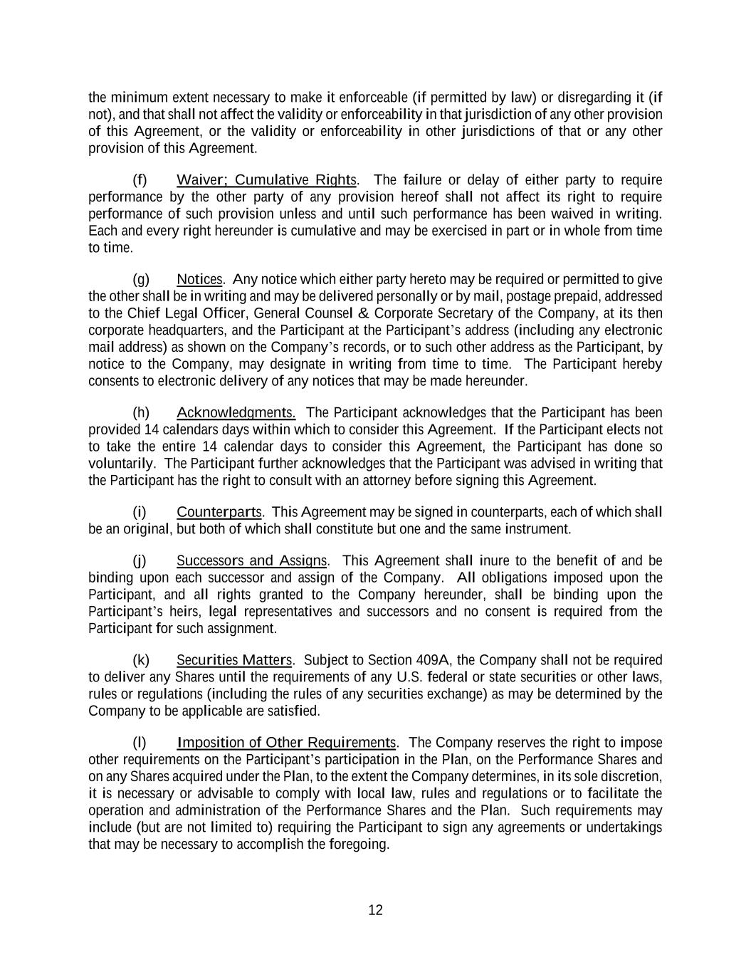 12使其可强制执行(如果法律允许)或无视它(如果不是)所需的最低限度,且不应影响本协议任何其他条款在该司法管辖区的有效性或可强制执行性,或该或本协议任何其他条款在其他司法管辖区的有效性或可强制执行性。(f)放弃;累积权利。任何一方未能或迟延要求另一方履行本协议的任何规定,不应影响其要求履行该规定的权利,除非且直至该履行已被书面放弃。本协议项下的每一项权利均为累积性的,可不时部分或全部行使。(g)通知。任何一方可能被要求或被允许给予另一方的任何通知均应以书面形式送达,并可亲自送达或以邮寄方式送达,邮资预付,寄给公司当时的公司总部的首席法务官、总法律顾问和公司秘书,以及公司记录上显示的参与者地址(包括任何电子邮件地址)的参与者,或通过向公司发出通知而不时以书面形式指定的参与者的其他地址。参与者特此同意以电子方式交付根据本协议可能发出的任何通知。(h)致谢。参与者承认,已向参与者提供了14个日历日,可在其中考虑本协议。如果参与者选择不花整个14个日历天来考虑本协议,则参与者已自愿这样做。参与者进一步承认,参与者被书面告知,参与者有权在签署本协议之前咨询律师。(i)对应方。本协议可由对应方签署,每份协议应为正本,但两者应仅构成一份相同的文书。(j)继任人和受让人。本协议应对公司的每一位继任者和受让人有利,并对其具有约束力。对参与者施加的所有义务,以及根据本协议授予公司的所有权利,均对参与者的继承人、法定代表人和继承人具有约束力,此类转让不需要参与者的同意。(k)证券事项。在符合第409A条的规定下,在满足任何美国联邦或州证券或公司可能确定适用的其他法律、规则或条例(包括任何证券交易所的规则)的要求之前,公司不得被要求交付任何股份。(l)强加其他要求。公司保留对参与者参与计划、履约股份和根据计划获得的任何股份施加其他要求的权利,但以公司全权酌情确定有必要或可取的情况为限,以遵守当地法律、规则和法规或促进履约股份和计划的运营和管理。此类要求可能包括(但不限于)要求参与者签署为实现上述目的可能需要的任何协议或承诺。