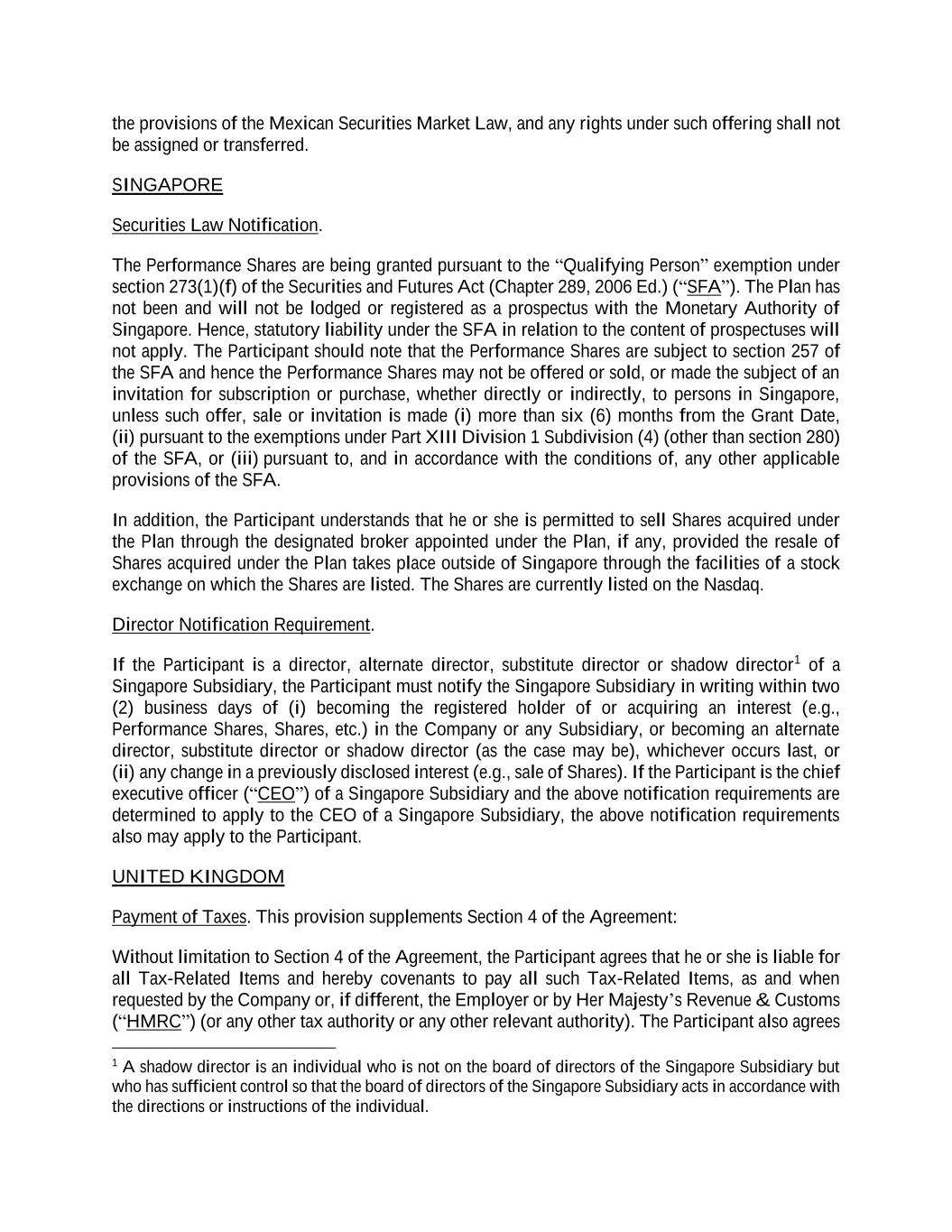 墨西哥证券市场法的规定,不得转让或转让此类发行下的任何权利。新加坡证券法通告。业绩股份是根据《证券和期货法》(2006年版第289章)(“SFA”)第273(1)(f)条规定的“合格人员”豁免授予的。该计划没有也不会作为招股章程提交或注册于新加坡金融管理局。因此,SFA规定的与招股说明书内容相关的法定责任将不适用。参与者应注意,履约股份受证监会第257条规限,因此,履约股份不得直接或间接向新加坡人要约或出售,或作出认购或购买邀请的标的,除非该要约、出售或邀请是(i)自授出日期起超过六(6)个月,(ii)根据证监会第十三部第1分部第(4)款(第280条除外)项下的豁免作出,或(iii)根据及根据以下条件作出,SFA的任何其他适用条款。此外,参与者了解,他或她被允许通过根据该计划指定的指定经纪人(如有)出售根据该计划获得的股份,前提是根据该计划获得的股份的转售发生在新加坡境外,通过股份上市的证券交易所的设施进行。股票目前在纳斯达克上市。董事通知规定。如果参与者是新加坡子公司的董事、候补董事、替代董事或影子董事1,则参与者必须在(i)成为公司或任何子公司的注册持有人或获得权益(例如,业绩股份、股份等),或成为候补董事、替代董事或影子董事(视情况而定)(以最后发生者为准)的两(2)个工作日内以书面通知新加坡子公司,或(ii)先前披露的权益的任何变化(例如,出售股份)。如果参与者是新加坡子公司的首席执行官(“CEO”),且上述通知要求被确定适用于新加坡子公司的首席执行官,则上述通知要求也可能适用于参与者。英国缴税。这项规定补充了协议第4节:在不限于协议第4节的情况下,参与者同意他或她对所有与税务相关的项目承担责任,并在此承诺在公司或(如果不同)雇主或英国税务海关总署(“HMRC”)(或任何其他税务机关或任何其他相关机关)要求时支付所有此类与税务相关的项目。参与者还同意1影子董事是指不在新加坡子公司董事会但拥有足够控制权以使新加坡子公司董事会按照个人的指示或指示行事的个人。