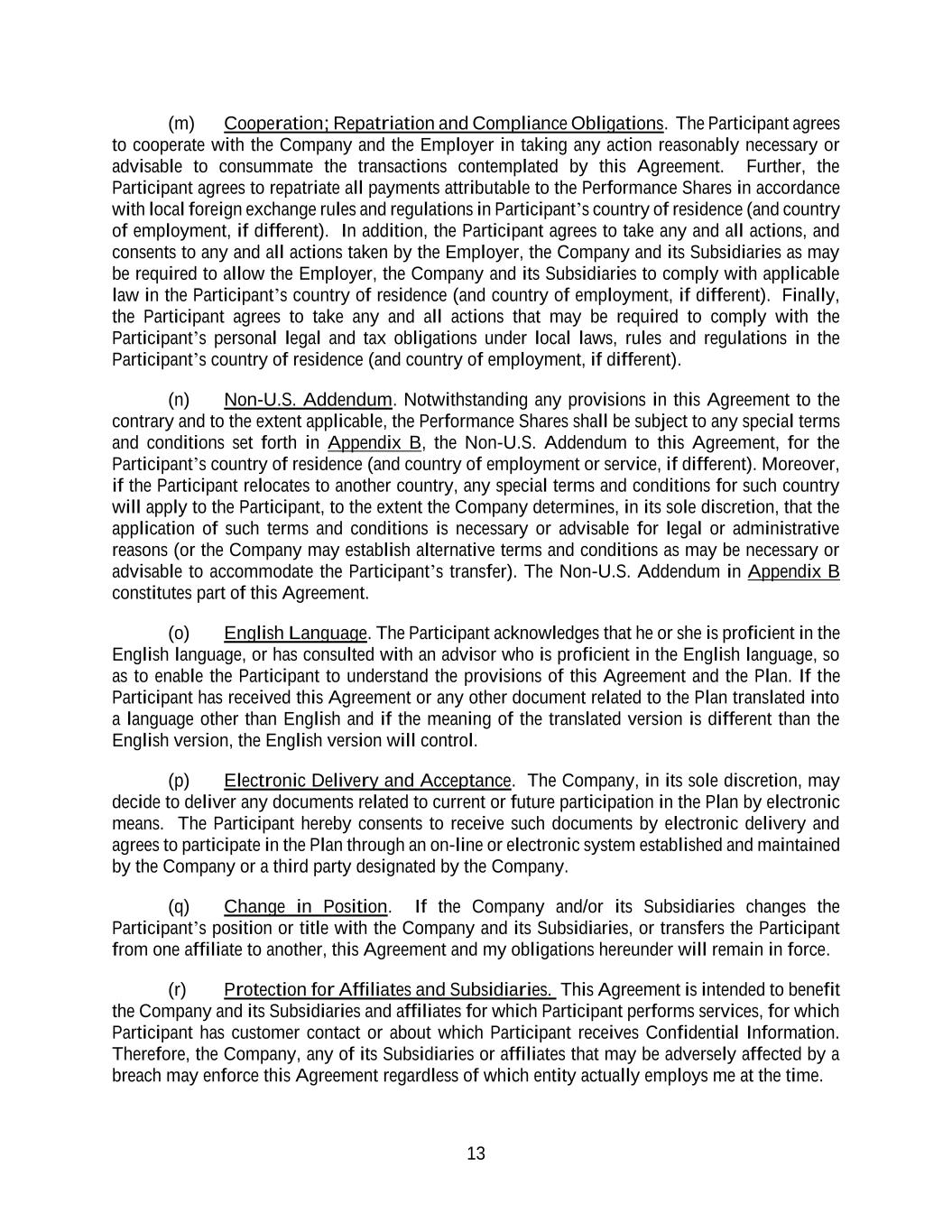 13(m)合作;遣返和遵守义务。参与者同意与公司和雇主合作,采取任何合理必要或可取的行动,以完成本协议所设想的交易。此外,参与者同意根据参与者居住国(以及就业国家,如果不同)的当地外汇规则和规定,汇回所有归属于业绩份额的款项。此外,参与者同意采取任何和所有行动,并同意雇主、公司及其子公司可能需要采取的任何和所有行动,以允许雇主、公司及其子公司遵守参与者居住国(以及就业国家,如果不同)的适用法律。最后,参与者同意采取可能需要的任何和所有行动,以遵守参与者居住国(以及就业国家,如果不同)当地法律、规则和条例规定的参与者个人法律和税收义务。(n)非美国增编。尽管本协议中有任何相反的规定并在适用的范围内,履约份额应受本协议的非美国增编附录B中为参与者的居住国(以及就业或服务国家,如果不同)规定的任何特殊条款和条件的约束。此外,如果参与者搬迁至另一国家,该国家的任何特殊条款和条件将适用于参与者,但前提是公司自行决定,由于法律或行政原因,适用此类条款和条件是必要或可取的(或公司可制定可能必要或可取的替代条款和条件,以适应参与者的转移)。附录B中的非美国增编构成本协议的一部分。(o)英语。参与者承认自己精通英语,或咨询过精通英语的顾问,以使参与者理解本协议和计划的规定。如参与者已收到本协议或与计划有关的任何其他文件翻译成英文以外的语言,且翻译版本的含义与英文版本不同,则由英文版本控制。(p)电子交付和验收。公司可全权酌情决定以电子方式交付与当前或未来参与该计划有关的任何文件。参与者特此同意以电子交付方式接收此类文件,并同意通过公司或公司指定的第三方建立和维护的在线或电子系统参与该计划。(q)立场变化。如公司及/或其附属公司改变参与者在公司及其附属公司的职位或头衔,或将参与者从一个附属公司转移至另一个附属公司,本协议及本人在本协议项下的义务将继续有效。(r)对附属公司和附属公司的保护。本协议旨在使公司及其附属公司受益,参与者为其提供服务,参与者为其有客户联系或参与者收到机密信息。因此,公司、其任何可能受到违约不利影响的子公司或关联公司可以强制执行本协议,无论当时实际雇用我的是哪个实体。