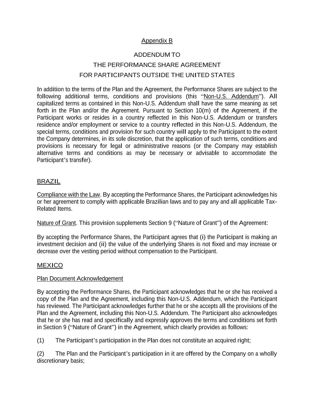 美国境外参与者履约份额协议附录B除计划和协议条款外,履约份额受以下附加条款、条件和规定(本“非美国增编”)的约束。本非美国增编中包含的所有大写术语应具有计划和/或协议中规定的相同含义。根据协议第10(m)节,如果参与者在本非美国增编所反映的国家工作或居住,或将居住和/或就业或服务转移至本非美国增编所反映的国家,则该国家的特殊条款、条件和规定将适用于参与者,前提是公司自行决定,由于法律或行政原因,适用此类条款、条件和规定是必要的(或公司可制定替代条款和条件,以适应参与者的转移)。巴西遵守法律。通过接受履约份额,参与者确认其同意遵守适用的巴西法律并支付任何和所有适用的与税收相关的项目。格兰特的性质。这一规定补充了协议第9节(“授予性质”):通过接受履约股份,参与者同意(i)参与者正在做出投资决定,并且(ii)基础股份的价值不是固定的,并且可以在归属期内增加或减少,而无需向参与者提供补偿。墨西哥计划文件确认通过接受绩效份额,参与者确认他或她已收到计划和协议的副本,包括参与者已审查的这份非美国增编。参与者进一步确认,他或她接受计划和协议的所有条款,包括本非美国增编。参与者还承认,他或她已阅读并具体明确批准协议第9节(“授予性质”)中规定的条款和条件,该条款明确规定如下:(1)参与者参与计划不构成后天获得的权利;(2)该计划和参与者参与计划由公司全权酌情提供;