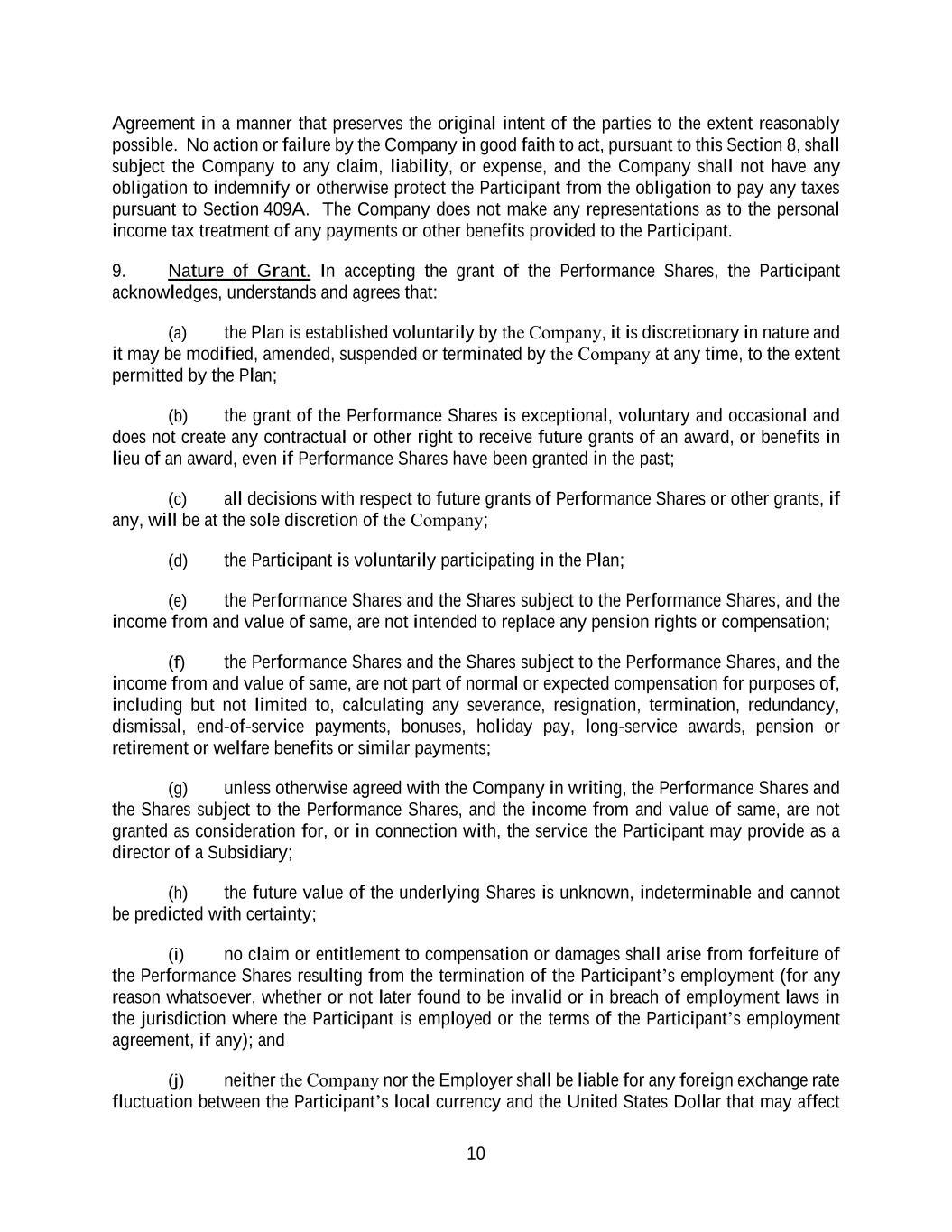 10以在合理可能范围内保持当事人原意的方式达成协议。公司根据本条第8款采取的任何行动或未能善意地采取行动,均不得使公司承担任何索赔、责任或费用,且公司没有任何义务根据第409A条赔偿或以其他方式保护参与者免于支付任何税款的义务。公司不对向参与者提供的任何付款或其他福利的个人所得税处理作出任何陈述。9.格兰特的性质。在接受授予绩效股份时,参与者承认、理解并同意:(a)该计划由公司自愿设立,其性质为酌情决定,公司可在计划允许的范围内随时对其进行修改、修订、暂停或终止;(b)绩效股份的授予是例外的、自愿的和偶发的,并且不会产生任何合同或其他权利来获得未来授予的奖励或代替奖励的利益,即使过去已授出绩效股份;(c)有关未来授出绩效股份或其他授出(如有)的所有决定将由公司全权酌情决定;(d)参与者自愿参与计划;(e)绩效股份及受绩效股份规限的股份,以及来自该等股份的收入及价值,均无意取代任何退休金权利或补偿;(f)绩效股份及受绩效股份规限的股份,以及来自该等股份的收入及价值,不属于正常或预期补偿的一部分,其目的包括但不限于计算任何遣散费、辞职费、解雇费、裁员、解雇、服务终止费、奖金、假期工资、长期服务奖励、退休金或退休金或福利福利或类似付款;(g)除非与公司另有书面协议,否则业绩股份及业绩股份受规限的股份,以及来自该等股份的收入及价值,不会作为参与者作为附属公司董事可能提供的服务的代价或与之有关;(h)相关股份的未来价值未知,无法确定且无法确定地预测;(i)不得因参与者的雇佣关系终止(无论出于任何原因,无论后来是否被认定为无效或违反参与者受雇所在司法管辖区的雇佣法律或参与者的雇佣协议条款(如有)而导致的业绩份额被没收而产生索赔或获得赔偿或损害的权利;(j)公司和雇主均不对参与者的当地货币与美元之间的任何可能影响的外汇汇率波动承担责任