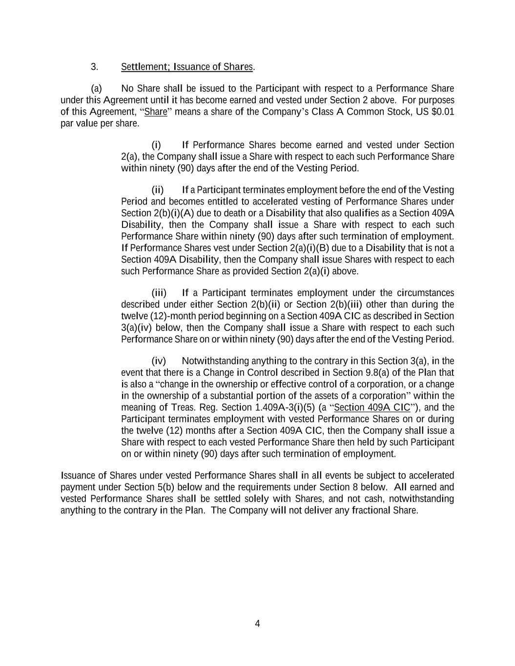 4 3.结算;发行股份。(a)在根据上文第2条赚取并归属之前,不得就本协议项下的履约份额向参与者发行任何份额。就本协议而言,“股份”是指公司A类普通股的一股,每股面值0.01美元。(i)倘业绩股份根据第2(a)条赚取及归属,公司须于授予期结束后九十(90)日内就每一该等业绩股份发行股份。(ii)如任何参与者因死亡或同样符合第409A条残疾的残疾而在授予期结束前终止雇用,并有权根据第2(b)(i)(a)条获得加速归属表现股份,则公司须在该终止雇用后九十(90)天内就每一该等表现股份发行一股股份。倘表现股份因并非第409A条残疾而根据第2(a)(i)(b)条归属,则公司须按上文第2(a)(i)条的规定就每一该等表现股份发行股份。(iii)如任何参与者在第2(b)(ii)条或第2(b)(iii)条所述的情况下终止雇佣,但在下文第3(a)(iv)条所述的第409A条中投公司开始的十二(12)个月期间内除外,则公司须于授予期结束后的九十(90)天内或就每一该等履约股份发行股份。(iv)尽管本第3(a)条另有规定,但如计划第9.8(a)条所述控制权变更亦属Treas所指的“公司的所有权或有效控制权的变更,或公司大部分资产的所有权的变更”,则即使出现该等变更,亦属例外。Reg.第1.409A-3(i)(5)条(“第409A条中投”),且参与者于第409A条中投后的十二(12)个月或期间以既得业绩股份终止雇佣,然后,公司应在该终止雇佣后的九十(90)天内或之后的九十(90)天内,就该参与者当时持有的每一股既得业绩股份发行一股股份。根据既得业绩股份发行的股份在所有情况下均须根据下文第5(b)节和下文第8节的要求进行加速支付。所有已赚取和已归属的业绩份额应仅以股份结算,而不是现金结算,尽管计划中有任何相反的规定。公司不会交付任何零碎股份。