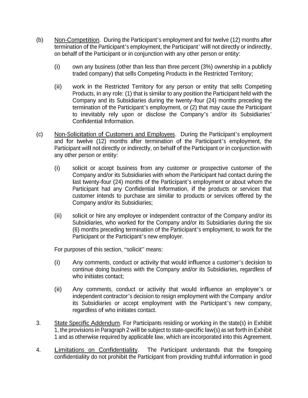 (b)不竞争。在参与者受雇期间以及在参与者受雇终止后的十二(12)个月内,参与者'将不会直接或间接代表参与者或与任何其他个人或实体:(i)拥有在受限区域内销售竞争产品的任何业务(公开交易公司的所有权少于百分之三(3%)除外);(ii)在受限区域内为销售竞争产品的任何个人或实体工作,担任任何角色:(1)与参与者在终止其雇佣关系前二十四(24)个月内在公司及其子公司担任的任何职位类似,或(2)可能导致参与者不可避免地依赖或披露公司和/或其子公司的机密信息。(c)不招揽客户和员工。在参与者受雇期间以及在参与者的雇佣终止后的十二(12)个月内,参与者将不会直接或间接代表参与者或与任何其他个人或实体:(i)向参与者在其受雇的最后二十四(24)个月内与其有联系或参与者有任何机密信息的公司和/或其子公司的任何客户或潜在客户招揽或接受业务,如客户拟购买的产品或服务与公司及/或其附属公司所提供的产品或服务相似;(ii)招揽或雇用公司及/或其附属公司的任何雇员或独立承建商,而他们在参与者的雇佣终止前六(6)个月内曾为公司及/或其附属公司工作,为参与者或参与者的新雇主工作。就本节而言,“征求”是指:(i)会影响客户决定继续与公司和/或其子公司开展业务的任何评论、行为或活动,无论谁发起联系;(ii)会影响员工或独立承包商决定辞去公司和/或其子公司的工作或接受参与者的新公司的工作的任何评论、行为或活动,无论谁发起联系。3.州特定增编。对于在附件 1中居住或工作在(s)个州的参与者,第2款中的规定将受制于附件 1中规定的州特定法律以及适用法律的其他要求,这些法律已纳入本协议。4.对保密的限制。与会人员理解,前述保密并不妨碍与会人员如实提供信息良好