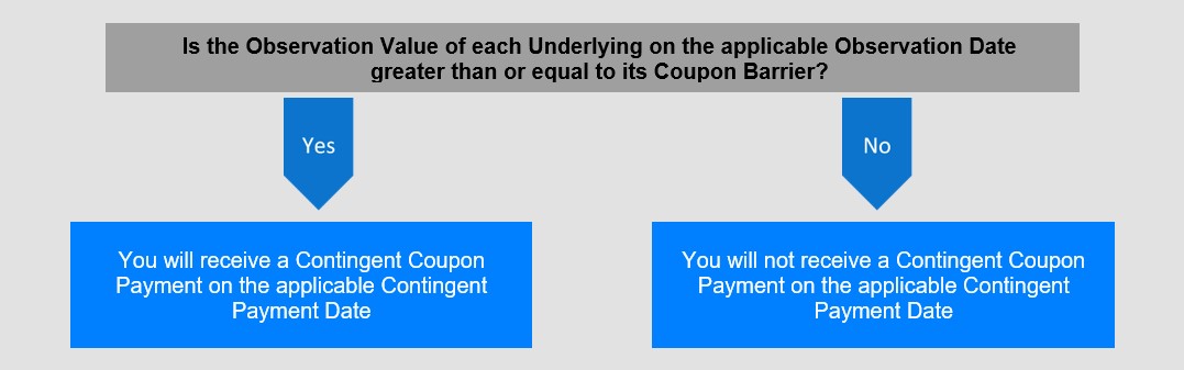 如果,在任何月度观察日,观察值为每个基础大于或等于其票息障碍,我们将在适用的或有支付日(包括到期日)支付每1,000.00美元票据本金至少7.50美元的或有票息支付(相当于每月至少0.75%的利率或每年至少9.00%的利率)。实际或有息票支付将在定价日确定。