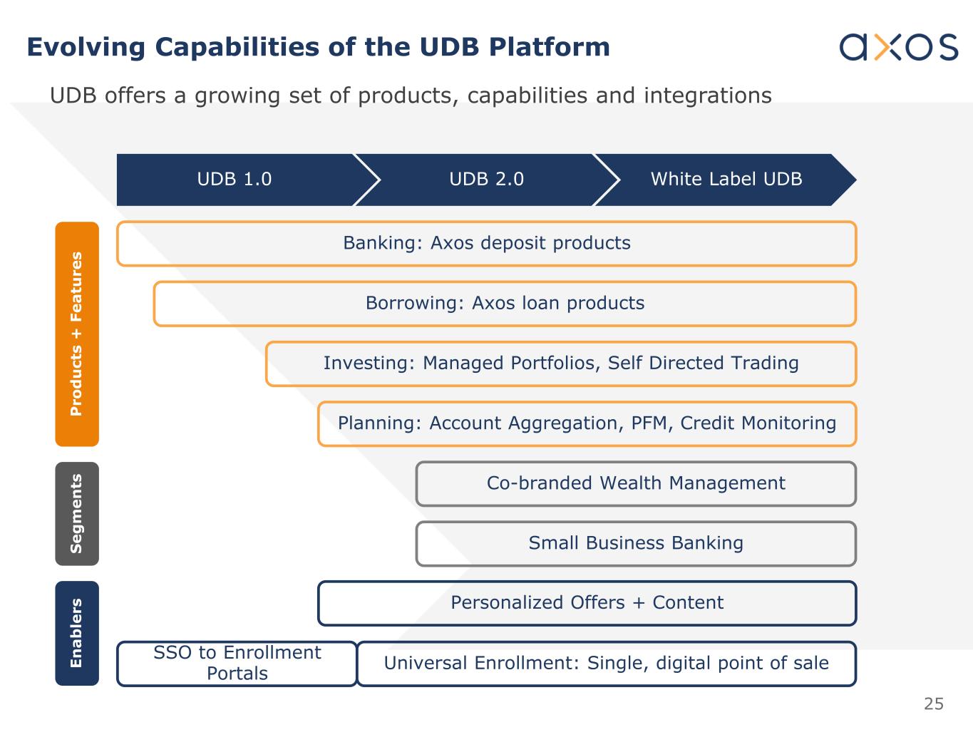UDB平台25项不断发展的能力UDB 1.0 UDB 2.0白标UDB银行:AxOS存款产品借款:AxOS贷款产品投资:托管投资组合、自定向交易规划:账户聚合、PFM、信用监控个性化优惠+内容联名财富管理SSO到注册门户通用注册:单一、数字销售点UDB提供一套不断增长的产品、能力和集成小型企业银行业务P ro d u ct s + F ea tu re s s eg m en ts en ab le rs