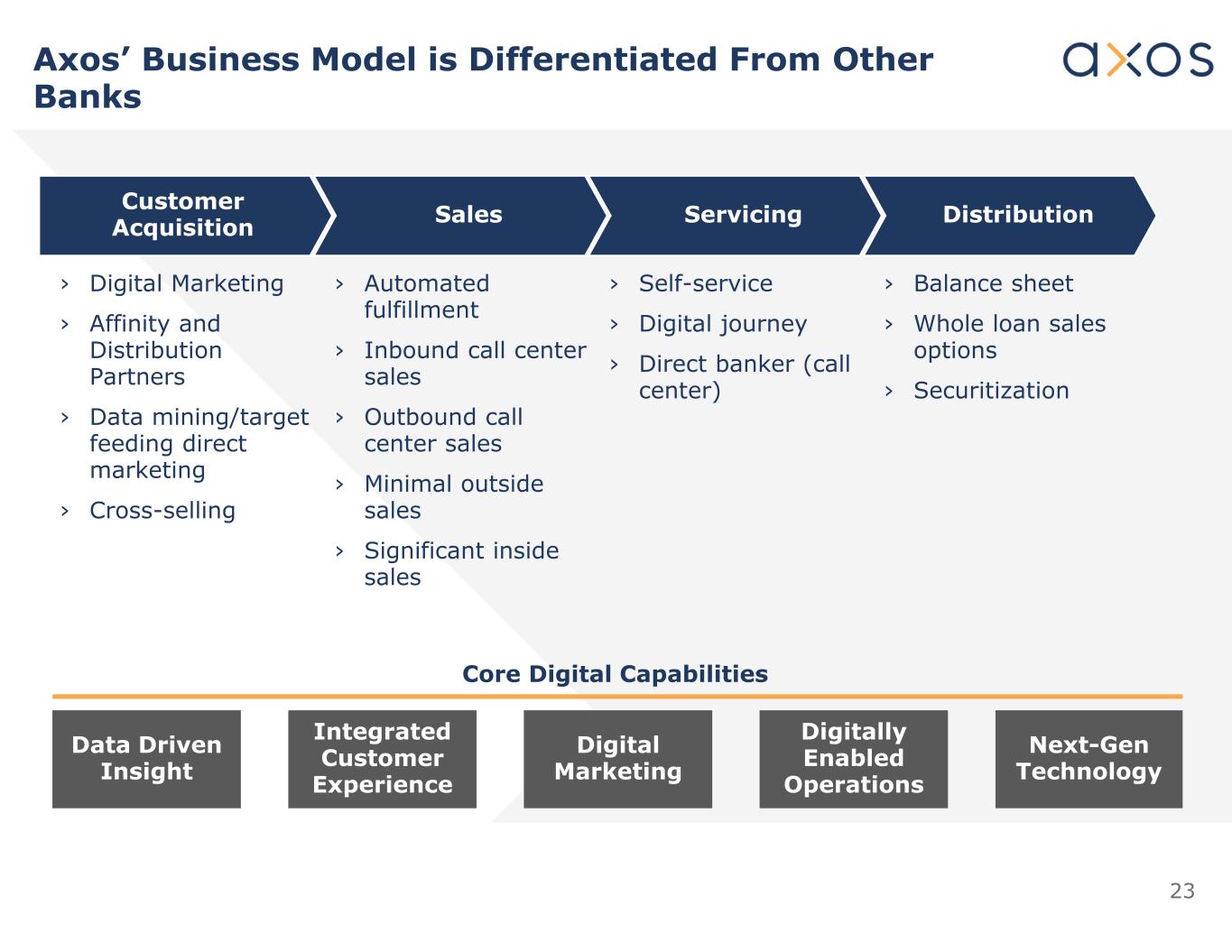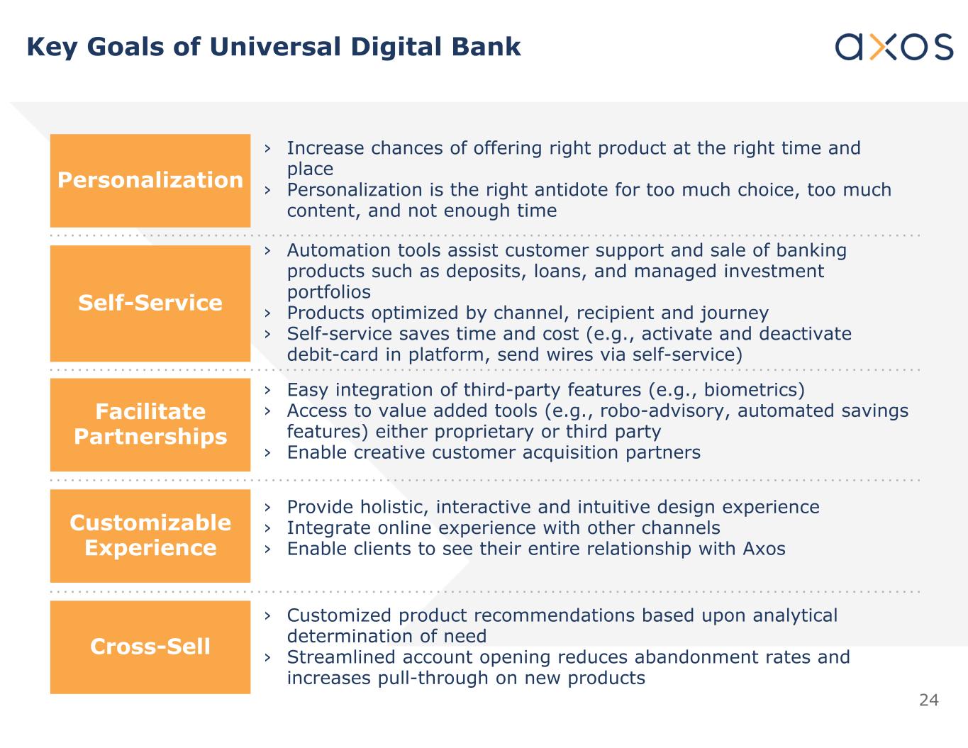 23客户获取销售服务分销丨数字营销丨亲和力和分销合作伙伴丨数据挖掘/目标反馈直销丨交叉销售丨自动化履行丨呼入呼叫中心销售丨呼出呼叫中心销售丨最小的外部销售丨重要的内部销售丨自助服务丨数字之旅丨直接银行家(呼叫中心)丨资产负债表丨整笔贷款销售选择丨证券化数据驱动洞察整合客户体验数字营销数字化运营下一代技术核心数字能力AxOS的商业模式与其他银行形成差异化