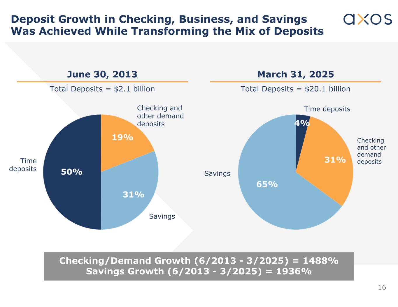 15多元存款聚集约90%存款为FDIC保险或抵押存款余额截至2025年3月31日注1:不包括约4.5亿美元的表外存款↓以排他性关系为约40%的美国第7章破产受托人提供服务丨软件允许为SEC接管人和非第7章案件提供服务丨全方位服务数字银行、财富管理,和证券交易丨白标银行丨提供简单的现金管理服务套件的商业银行丨HOA和物业管理丨商业管理和娱乐丨产权和托管公司丨1031家交易所丨经纪自营商客户现金丨经纪自营商准备金账户丨全套服务金库/现金管理丨团队增强和地域扩张丨银行和证券交叉销售受托服务$ 1.1B Consumer Direct $ 11.2B Specialty Deposits $ 1.9B Distribution Partners $ 0.4B Axos Securities $ 0.9B1 Small Business Banking $ 0.5B Commercial & Treasury Management $ 4.1B Diversified Deposit Gathering Business Lines