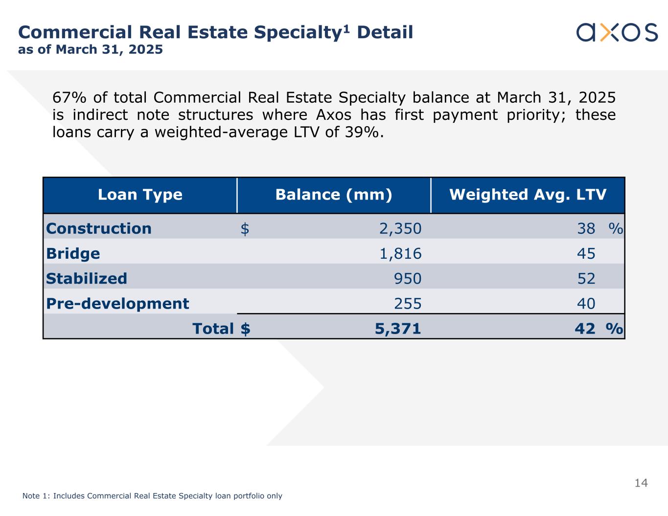 13商业地产专项1详情截至2025年3月31日非应计贷款(mm)加权平均LTVBalance(mm)Loan Type $ — 43% $ 1,485Multifamily 15381,211SFR — 58957Industrial — 41836Hotel 530380Office 1537326Other — 43176Retail $ 3542% $ 5,371Total LTV Distribution Note 1:Includes Commercial Real Estate Specialty Loan Portfolio only。