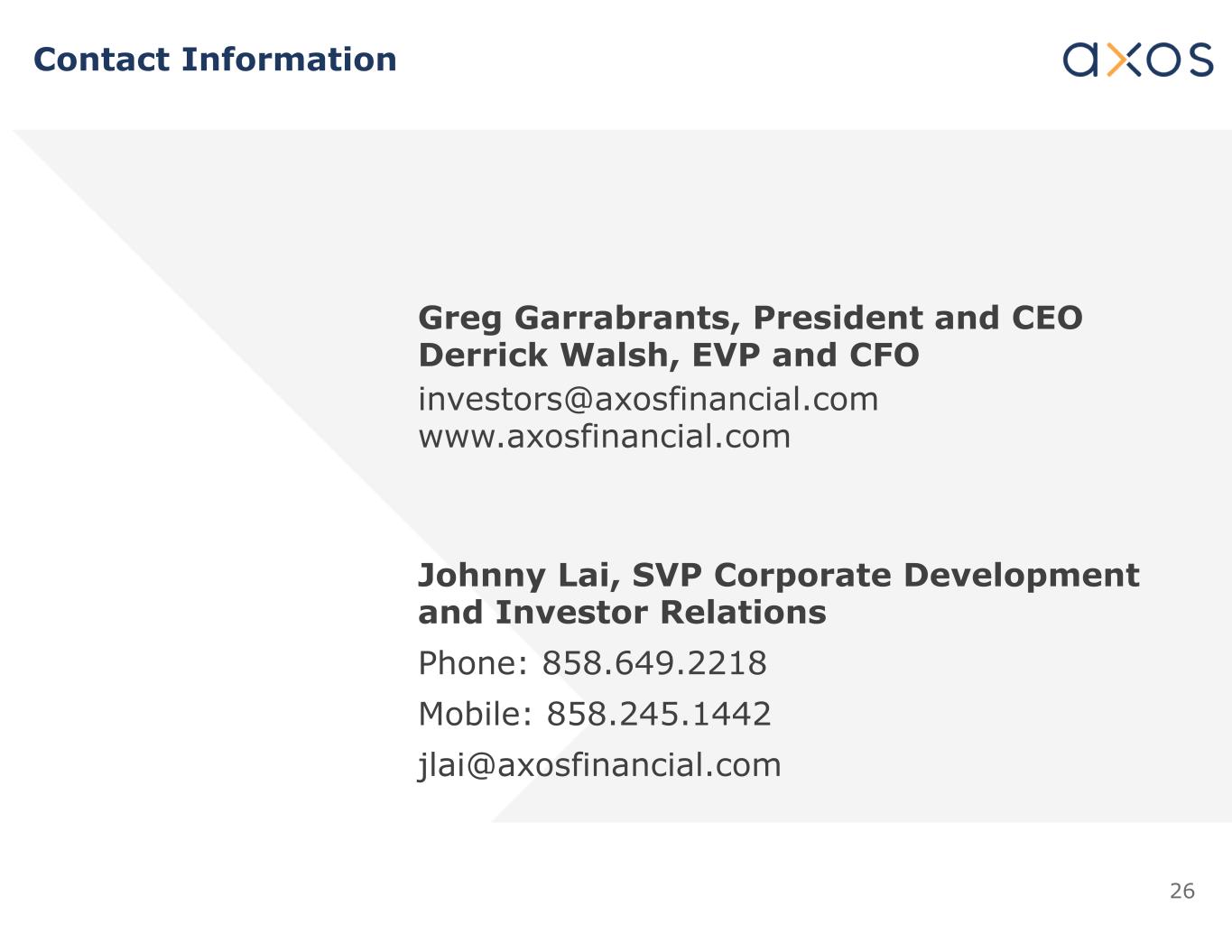 26 Greg Garrabrants,总裁兼首席执行官Derrick Walsh,执行副总裁兼首席财务官Investors@axosfinancial.com www.axosfinancial.com Johnny Lai,企业发展和投资者关系高级副总裁电话:858.6 49.22 18手机:858.24 5.14 42 jlai@axosfinancial.com联系方式