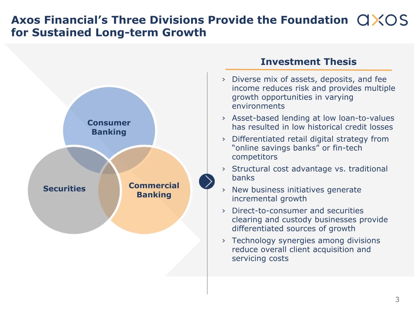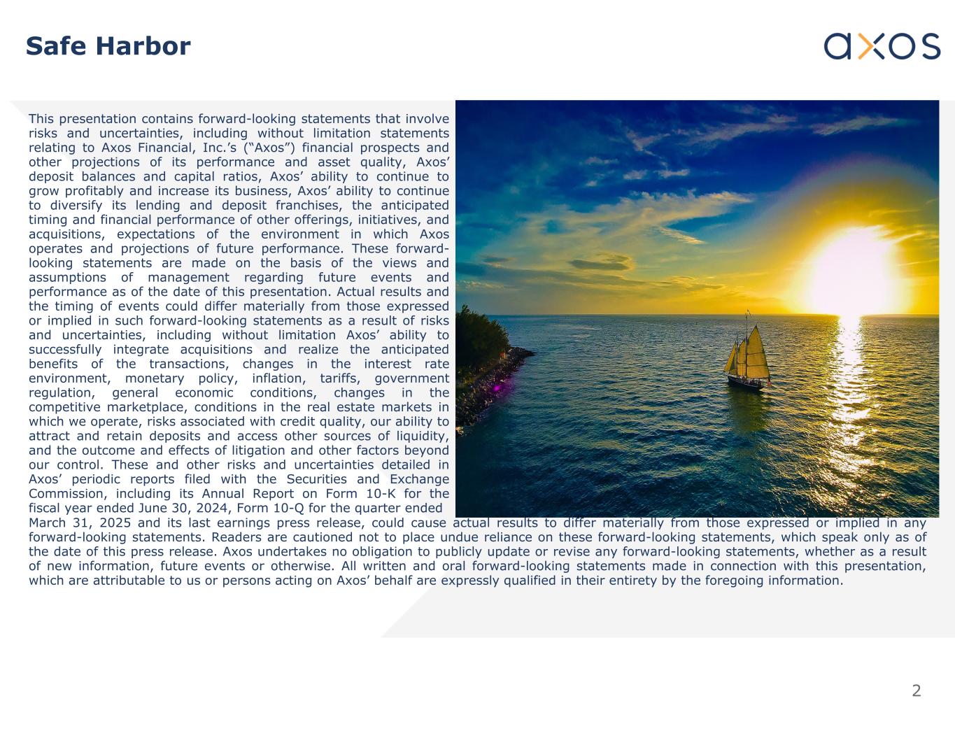2安全港本演示文稿包含涉及风险和不确定性的前瞻性陈述,包括但不限于与Axos Financial, Inc.(“Axos”)的财务前景以及对其业绩和资产质量的其他预测、Axos的存款余额和资本比率、Axos持续盈利增长和业务增加的能力、Axos继续使其贷款和存款特许经营权多样化的能力、其他产品、举措和收购的预期时间和财务业绩、对Axos运营环境的预期以及对未来业绩的预测有关的陈述。这些前瞻性陈述是基于管理层对截至本演示文稿发布之日的未来事件和业绩的看法和假设作出的。由于存在风险和不确定性,包括但不限于Axos成功整合收购和实现交易预期收益的能力、利率环境变化、货币政策、通货膨胀、关税、政府监管、总体经济状况、竞争性市场变化、我们经营所在的房地产市场状况、与信贷质量相关的风险、我们吸引和保留存款以及获得其他流动性来源的能力,实际结果和事件发生的时间可能与此类前瞻性陈述中明示或暗示的内容存在重大差异,以及诉讼的结果和影响以及我们无法控制的其他因素。Axos向美国证券交易委员会提交的定期报告中详述的这些和其他风险和不确定性,包括其截至2024年6月30日的财政年度的10-K表格年度报告、截至2025年3月31日的季度的10-Q表格及其最后一份收益新闻稿,可能导致实际结果与任何前瞻性陈述中明示或暗示的结果存在重大差异。告诫读者不要过分依赖这些前瞻性陈述,这些陈述仅在本新闻稿发布之日发表。Axos不承担公开更新或修改任何前瞻性陈述的义务,无论是由于新信息、未来事件或其他原因。与本演示文稿相关的所有书面和口头前瞻性陈述,凡可归因于我们或代表Axos行事的人,均完全受上述信息的明确限定。