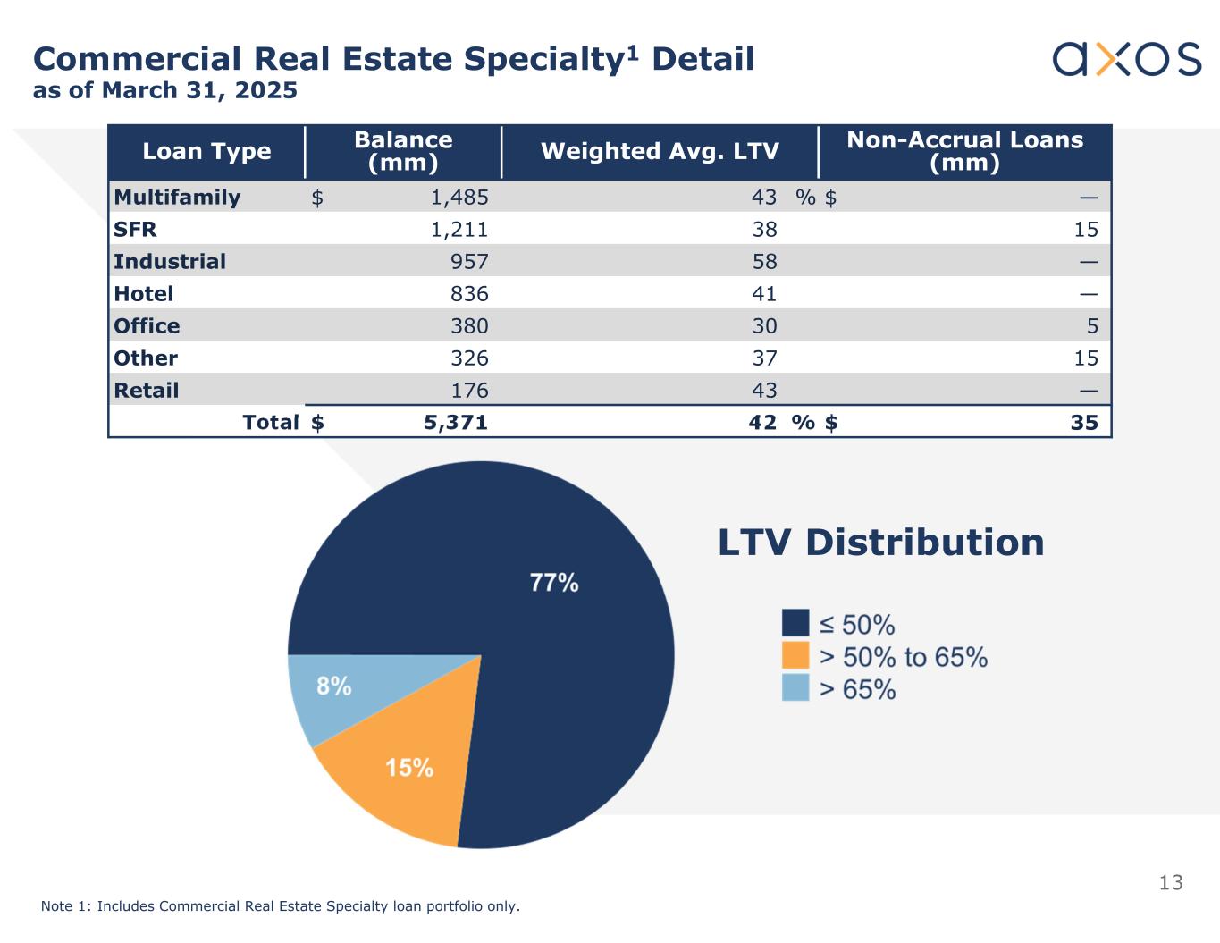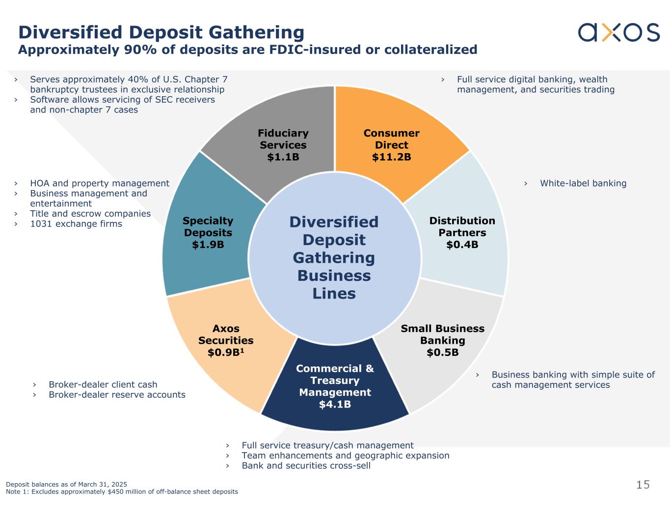 14商业地产Specialty1截至2025年3月31日的详细信息截至2025年3月31日,商业地产Specialty总余额的67%为间接票据结构,其中AxOS具有优先付款优先权;这些贷款的加权平均LTV为39%。注1:仅包括商业房地产专项贷款组合加权平均。LTVBalance(mm)贷款类型38% $ 2,350建筑451,816Bridge 52950稳定40255Pre-development 42% $ 5,371Total