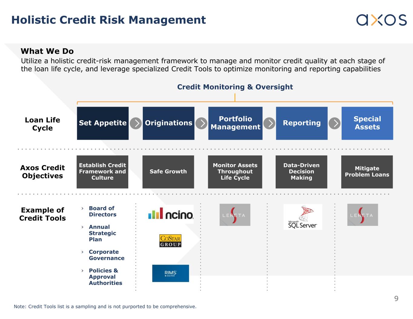 9整体信用风险管理我们做什么贷款生命周期利用整体信用风险管理框架,在贷款生命周期的每个阶段对信用质量进行管理和监测,并利用专门的信用工具优化监测和报告能力设置食欲来源组合管理报告特殊资产信用监测&监督AxOS信用目标信用工具示例丨董事会丨年度战略计划丨公司治理丨政策与审批机关注:信用工具清单为抽样,并不旨在全面。建立信用框架和文化安全增长监测资产全生命周期数据驱动决策缓解问题贷款