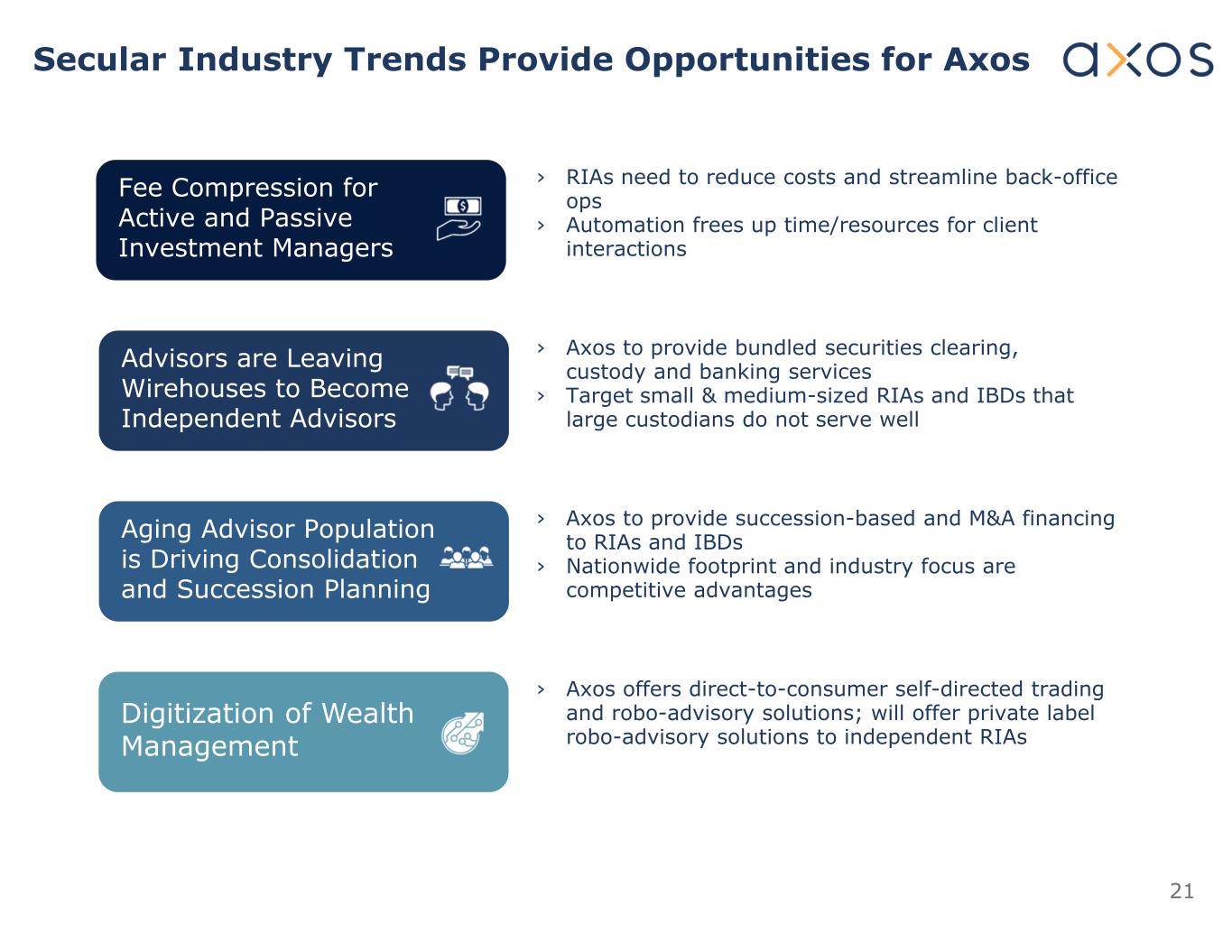 21个长期的行业趋势为AxOS提供了机会丨RIA需要降低成本并简化后台操作↓自动化为客户交互腾出时间/资源丨AxOS提供捆绑证券清算,托管和银行服务丨瞄准大型托管机构服务不佳的中小型RIA和IBD丨AxOS向RIA和IBD提供基于继承的和并购融资丨全国范围的足迹和行业聚焦是竞争优势丨AxOS提供直接面向消费者的自主交易和智能咨询解决方案;将为主动和被动投资经理提供独立RIA费用压缩的自有品牌智能咨询解决方案财富管理老龄化顾问的数字化人口正在推动整合,继任规划顾问正在离开Wirehouses成为独立顾问