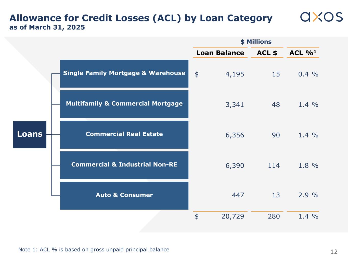 12截至2025年3月31日按贷款类别划分的信贷损失准备金(ACL)百万美元ACL % 1ACL $贷款余额0.4% 15 $ 4,1951.4% 483,3411.4% 906,3561.8% 1146,3902.9% 134471.4% 280 $ 20,729单户抵押和仓库多户和商业抵押商业房地产商业和工业非可再生能源汽车和消费者贷款注1:ACL %基于未付本金余额总额