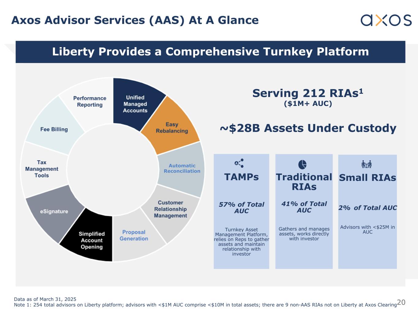 20 Axos Advisor Services(AAS)一览Liberty提供全面的交钥匙平台自动和解服务,服务于212个RIAS1($ 1m + AUC)~$ 28B资产托管下的小型RIA占AUC顾问总数的2%且AUC中< $ 2500万传统RIA占AUC总资产的41%收集和管理资产,直接与投资者TMP合作占AUC总交钥匙资产管理平台的57%,依靠Reps收集资产并与截至3月31日的投资者数据保持关系,2025年注1:Liberty平台上的顾问总数为254名;AUC < 100万美元的顾问构成总资产< 1000万美元;Axos Clearing有9个非AAS RIA不在Liberty上