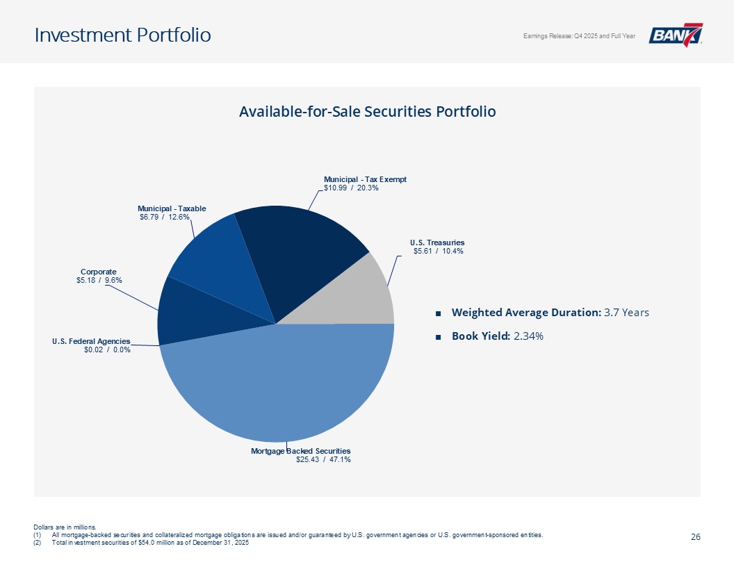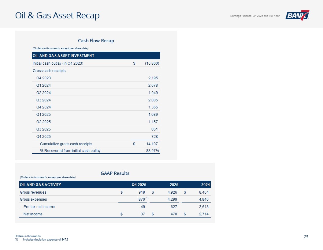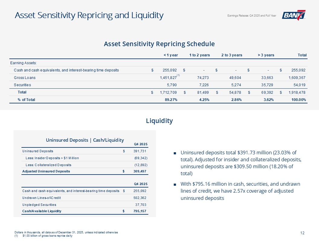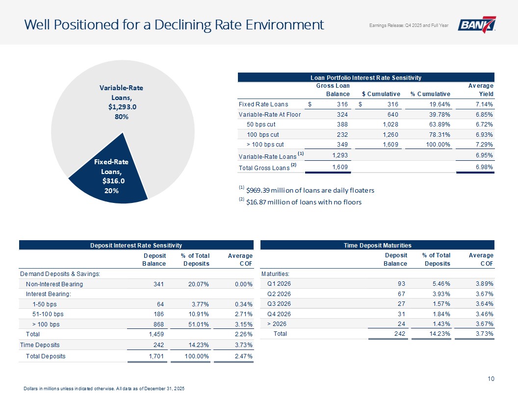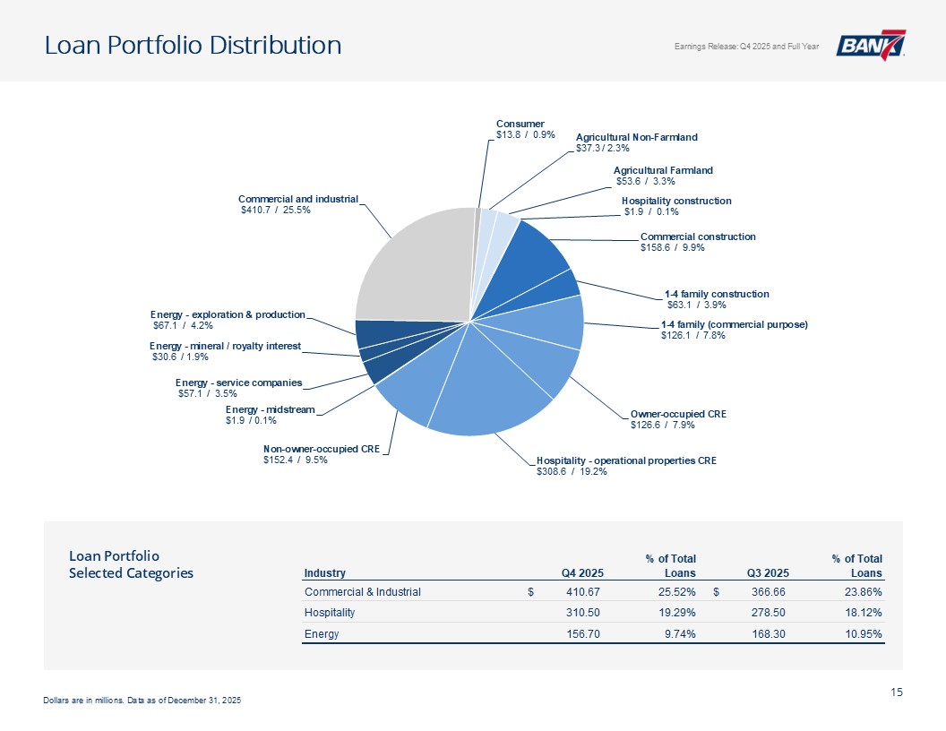 Q4及全年概览资产质量& CRE千美元,每股数据除外。所有数据截至2025年12月31日,除非另有说明非公认会计原则计量不包括4,299美元的石油和天然气非利息支出以及石油天然气收入4926美元调整后未保险存款计算EPS见幻灯片12:Q4-1.12美元;全年-4.50美元;核心盈利驱动ROAA:Q4-2.26 %;全年-2.37 % ROATCE:Q4-18.15 %;全年-19.47 % NIM(不含贷款手续费收入):Q4-4.45 %;全年– 4.61%效率比:全年– 40.24%;核心银行效率比37.71%(1)强劲的盈利和盈利能力CET1:14.09%一级杠杆:12.82% TCE/TA:12.25%显著高于监管“资本充足”门槛盈利强劲,派息率低,无债务,无HTM证券Prudent Capital Management现金+未质押证券+未提取信贷:7.9516亿美元(2.57倍覆盖率3.095亿美元(2)调整后未保险存款)≤ 1年内贷款重定价:14.5亿美元(90.21%),每日重定价10.00亿美元(60.23%)定位于在未来所有存款利率下调中占据很大一部分一致的资产负债表管理&可靠的流动性NCO:全年-5bps(净回收0.80百万美元)NPA/总贷款:40bps多样化的CRE投资组合(DFW、OKC和Tulsa Metros)办公室贷款平均规模(不包括建筑):103万美元业主占用:68万美元非业主占用:152万美元