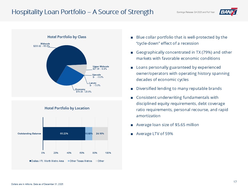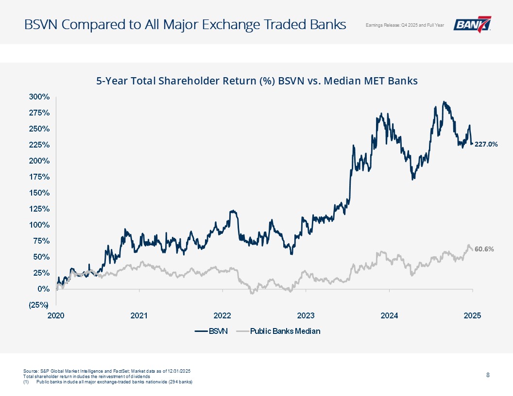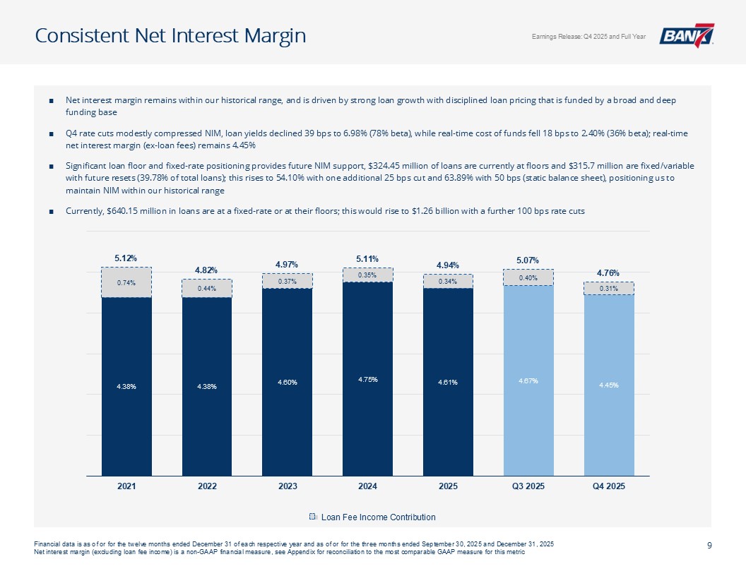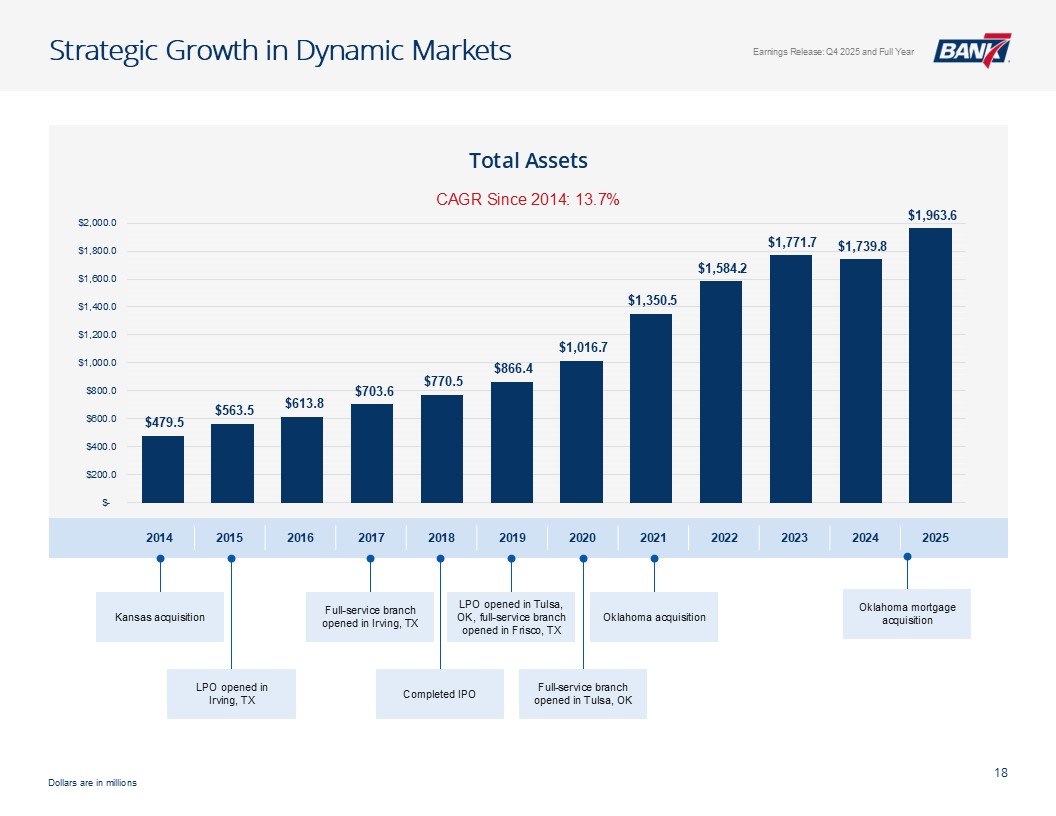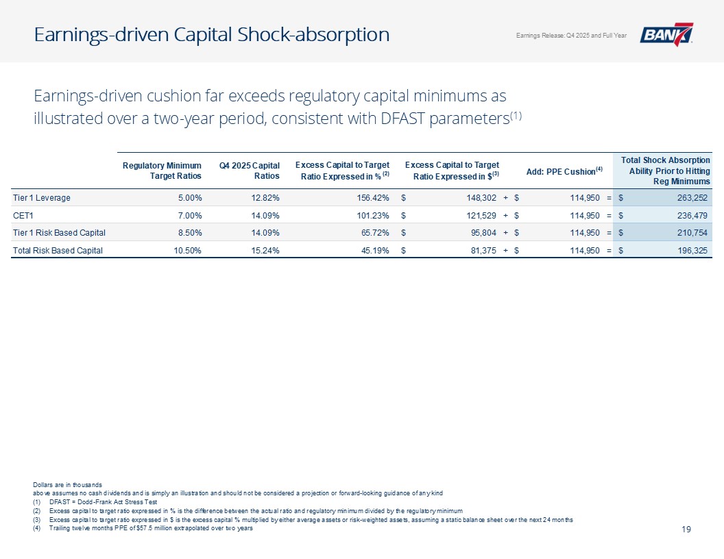 Q4及全年概览资产质量& CRE千美元,每股数据除外。所有数据截至2025年12月31日,除非另有说明非公认会计原则计量不包括4,299美元的石油和天然气非利息支出以及石油天然气收入4926美元调整后未保险存款计算EPS见幻灯片12:Q4-1.12美元;全年-4.50美元;核心盈利驱动ROAA:Q4-2.26 %;全年-2.37 % ROATCE:Q4-18.15 %;全年-19.47 % NIM(不含贷款手续费收入):Q4-4.45 %;全年– 4.61%效率比:全年– 40.24%;核心银行效率比37.71%(1)强劲的盈利和盈利能力CET1:14.09%一级杠杆:12.82% TCE/TA:12.25%显著高于监管“资本充足”门槛盈利强劲,派息率低,无债务,无HTM证券Prudent Capital Management现金+未质押证券+未提取信贷:7.9516亿美元(2.57倍覆盖率3.095亿美元(2)调整后未保险存款)≤ 1年内贷款重定价:14.5亿美元(90.21%),每日重定价10.00亿美元(60.23%)定位于在未来所有存款利率下调中占据很大一部分一致的资产负债表管理&可靠的流动性NCO:全年-5bps(净回收0.80百万美元)NPA/总贷款:40bps多样化的CRE投资组合(DFW、OKC和Tulsa Metros)办公室贷款平均规模(不包括建筑):103万美元业主占用:68万美元非业主占用:152万美元