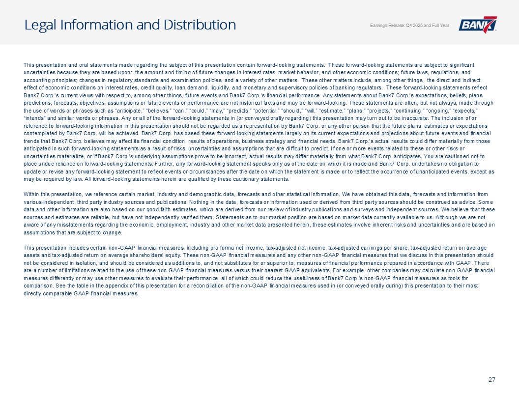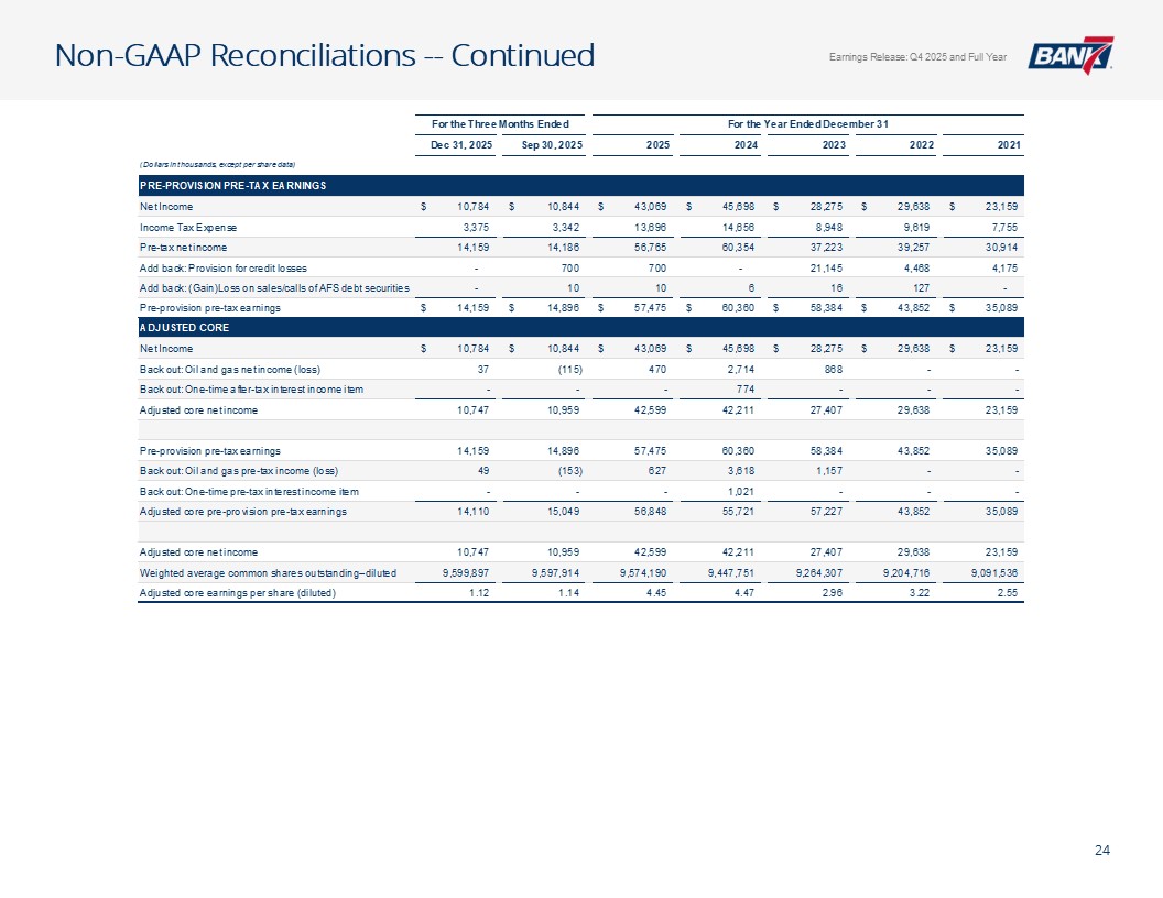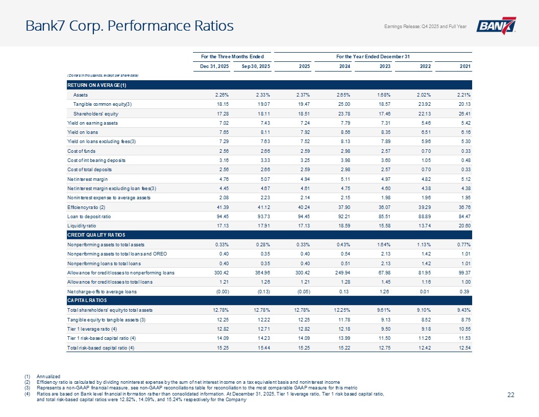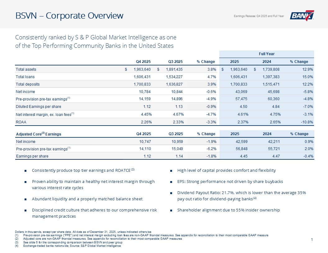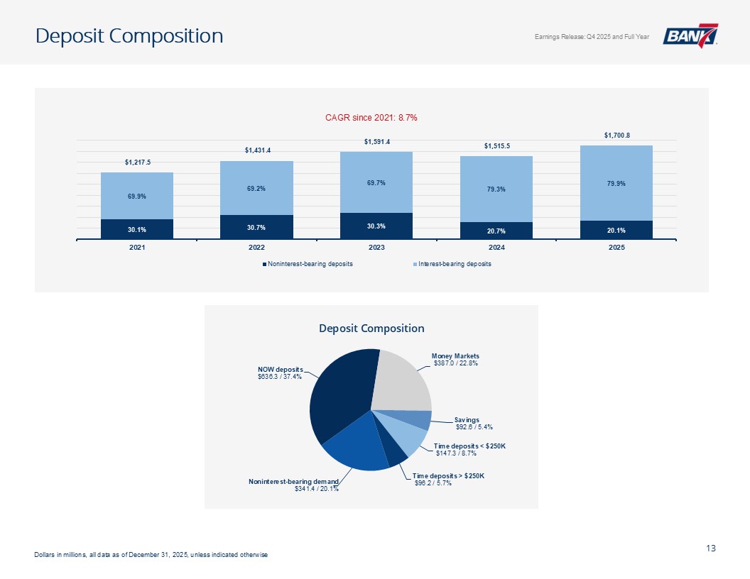 Q4及全年概览资产质量& CRE千美元,每股数据除外。所有数据截至2025年12月31日,除非另有说明非公认会计原则计量不包括4,299美元的石油和天然气非利息支出以及石油天然气收入4926美元调整后未保险存款计算EPS见幻灯片12:Q4-1.12美元;全年-4.50美元;核心盈利驱动ROAA:Q4-2.26 %;全年-2.37 % ROATCE:Q4-18.15 %;全年-19.47 % NIM(不含贷款手续费收入):Q4-4.45 %;全年– 4.61%效率比:全年– 40.24%;核心银行效率比37.71%(1)强劲的盈利和盈利能力CET1:14.09%一级杠杆:12.82% TCE/TA:12.25%显著高于监管“资本充足”门槛盈利强劲,派息率低,无债务,无HTM证券Prudent Capital Management现金+未质押证券+未提取信贷:7.9516亿美元(2.57倍覆盖率3.095亿美元(2)调整后未保险存款)≤ 1年内贷款重定价:14.5亿美元(90.21%),每日重定价10.00亿美元(60.23%)定位于在未来所有存款利率下调中占据很大一部分一致的资产负债表管理&可靠的流动性NCO:全年-5bps(净回收0.80百万美元)NPA/总贷款:40bps多样化的CRE投资组合(DFW、OKC和Tulsa Metros)办公室贷款平均规模(不包括建筑):103万美元业主占用:68万美元非业主占用:152万美元