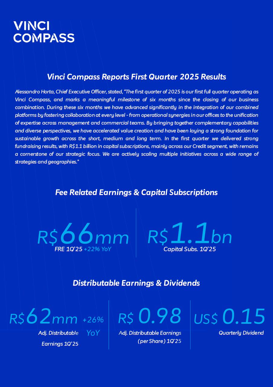 截至2025年3月31日的季度,与费用相关的收益(“FRE”)为6570万雷亚尔(合每股1.04雷亚尔),绝对同比增长22%,每股同比增长3%,这是由于与Compass合并产生的管理和咨询费用增加、收购MAV和Lacan以及私募股权和实物资产基金的有机筹资。截至2025年3月31日的过去十二个月的FRE为2.604亿雷亚尔(4.45雷亚尔/股),与截至2024年3月28日的过去十二个月相比,按绝对值计算增长22%,按每股计算增长12%。