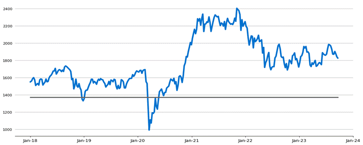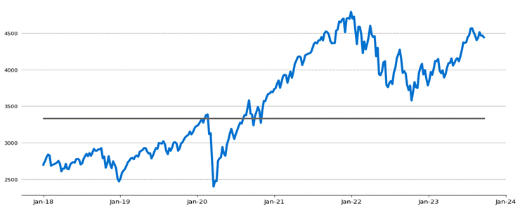 下图列出了SPX在2018年1月2日至2023年9月19日期间的每日历史表现。我们从Bloomberg L.P.获得了这些历史数据。我们尚未独立核实从Bloomberg L.P.获得的信息的准确性或完整性。图中的水平线代表SPX假设的票息障碍和假设的阈值3332.96(四舍五入到小数点后两位),这是SPX假设的起始值4443.95(2023年9月19日的收盘价)的75%。实际起始值、票息障碍和阈值将在定价日确定。