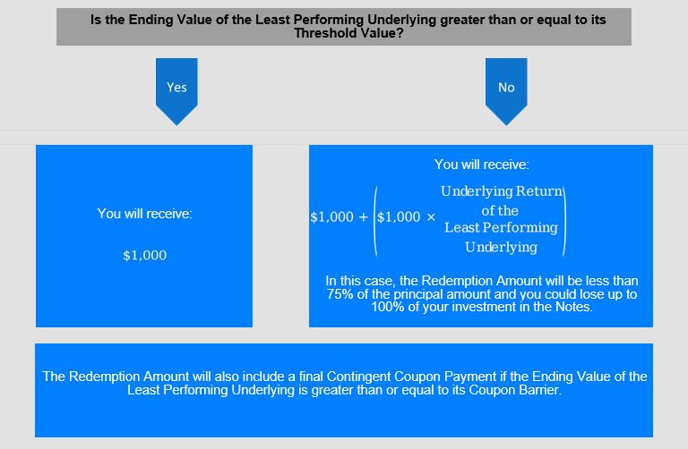 | ● | 假设债券未在到期前赎回,如果任何 基础资产下跌超过25从其起始值的%,到期时,您的投资将受到1:1的下行风险敞口,表现最差的标的价值下降,与高达100有风险的本金的百分比;否则,到期时你将收到本金。在到期时,您还将收到最后的特遣队息票支付,如果收盘水平每个 在最后观察日的基础资产大于或等于75起始值的%。 |