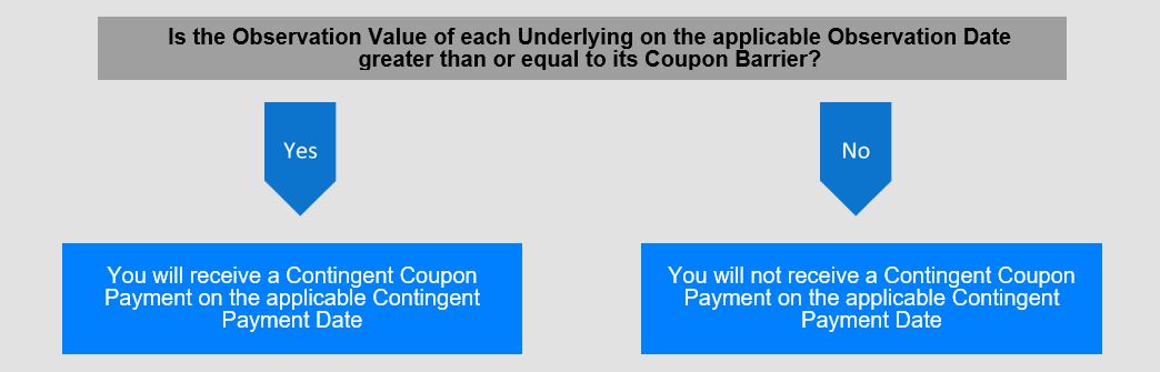 如果在任何季度观察日,每个如果标的资产大于或等于其票息障碍,我们将在适用的或有支付日(包括到期日)支付每1,000美元票据本金17.625美元的或有票息(相当于每季度1.76 25%或每年7.05%的利率)。 |