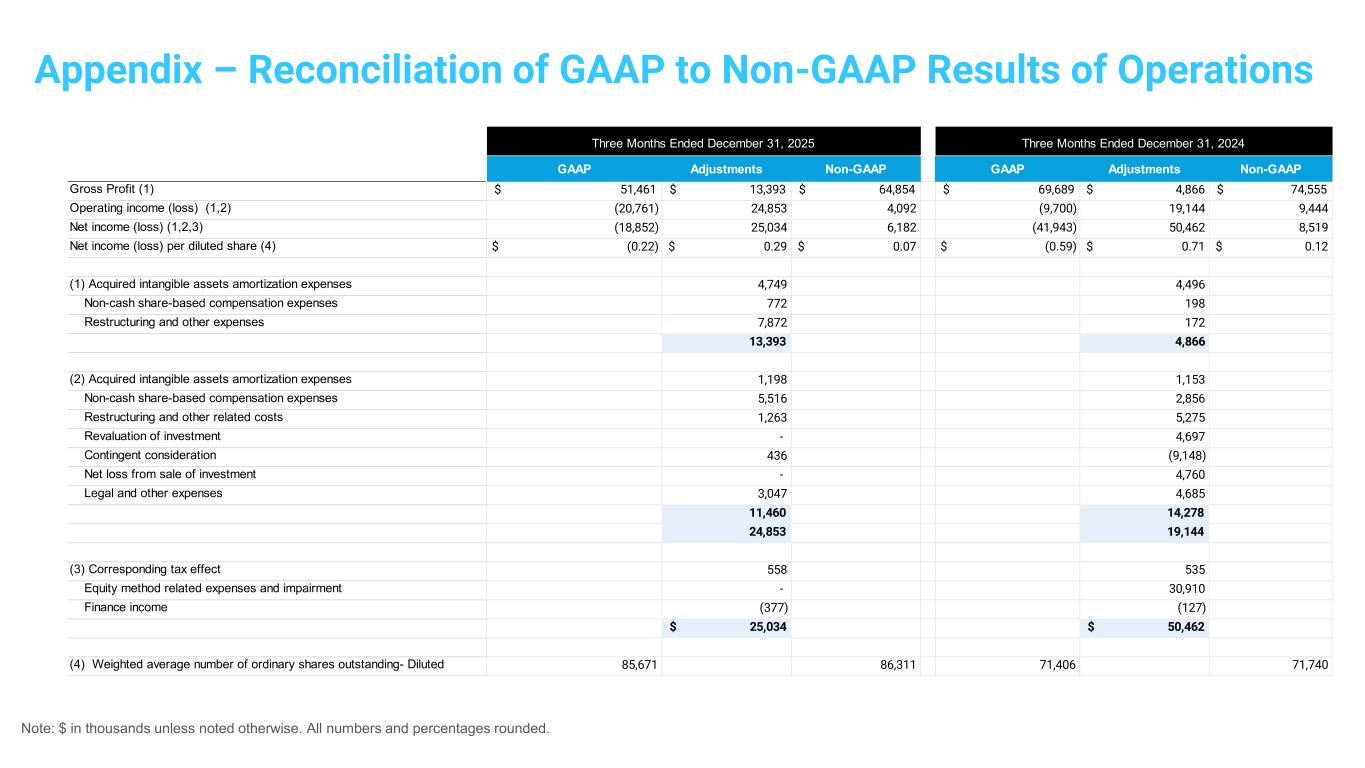 注:除非另有说明,否则以千美元为单位。所有数字和百分比四舍五入。附录– GAAP与Non-GAAP经营业绩的对账GAAP调整Non-GAAP调整Non-GAAP毛利润(1)$ 51,461 $ 13,393 $ 64,854 $ 69,689 $ 4,866 $ 74,555营业收入(亏损)(1,2)(20,761)24,8534,092(9,700)19,1449,444净收益(亏损)(1,2,3)(18,852)25,0346,182(41,943)50,4628,519每摊薄净收益(亏损)(4)$(0.22)$ 0.29 $ 0.07 $(0.59)$ 0.71 $ 0.12(1)收购的无形资产摊销费用4,7494,496非现金股份补偿费用772198重组及其他费用7,87217213,3934,866(2)取得的无形资产摊销费用1,1981,153非现金股份补偿费用5,5162,856重组及其他相关费用1,2635,275重估投资-4,697或有对价436(9,148)出售投资净亏损-4,760法律及其他费用3,0474,68511,46014,27824,85319,144(3)相应税收影响558535权益法相关费用和减值-30,910财务收入(377)(127)$ 25,034 $ 50,462(4)加权平均已发行普通股股数-稀释85,67186,31171,40671,740截至12月31日止三个月,2025年截至2024年12月31日止三个月