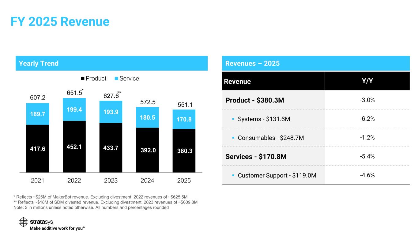 收入– 2025年收入Y/Y产品-3.803亿美元-3.0 %▪Systems-1.316亿美元-6.2 %▪消耗品-2.487亿美元-1.2 %服务-1.708亿美元-5.4 %▪客户支持-$ 1.190亿-4.6 % FY 2025 Revenue Make additive work for you yearly trend 417.6452.14 33.73 92.03 80.3189.7 199.4193.9 180.51 70.8 202120222022202320242025 Product Service****反映了约2600万美元的MakerBot收入。不包括撤资,2022年收入约为6.255亿美元**反映了约1800万美元的SDM剥离收入。不包括撤资,2023年收入约为6.098亿美元注:以百万美元计,除非另有说明。所有数字和百分比四舍五入551.15 72.56 27.66 51.5 607.2