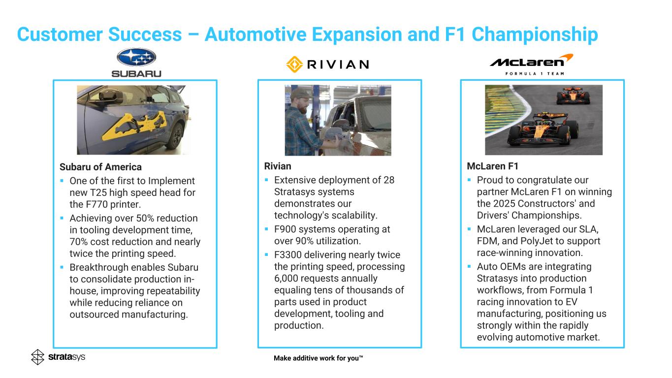 让添加剂为你工作美国斯巴鲁▪率先为F770打印机实现新型T25高速机头之一。▪实现工装开发时间缩短超50%,成本降低70%,打印速度提升近两倍。▪突破使斯巴鲁能够巩固内部生产,提高可重复性,同时减少对外包制造的依赖。客户成功–汽车扩张和F1锦标赛Rivian▪28个斯特塔西系统的广泛部署展示了我们技术的可扩展性。▪F900系统以超过90%的利用率运行。▪F3300提供了近两倍的打印速度,每年处理6000个请求,相当于产品开发、工具和生产中使用的数万个零件。迈凯轮F1▪自豪地祝贺我们的合作伙伴迈凯轮F1赢得了2025年车队和车手锦标赛。▪迈凯轮利用我们的SLA、FDM和PolyJet来支持赢得比赛的创新。▪汽车原始设备制造商正在将斯特塔西整合到生产工作流程中,从F1赛车创新到EV制造,这使我们在快速发展的汽车市场中获得了强有力的定位。