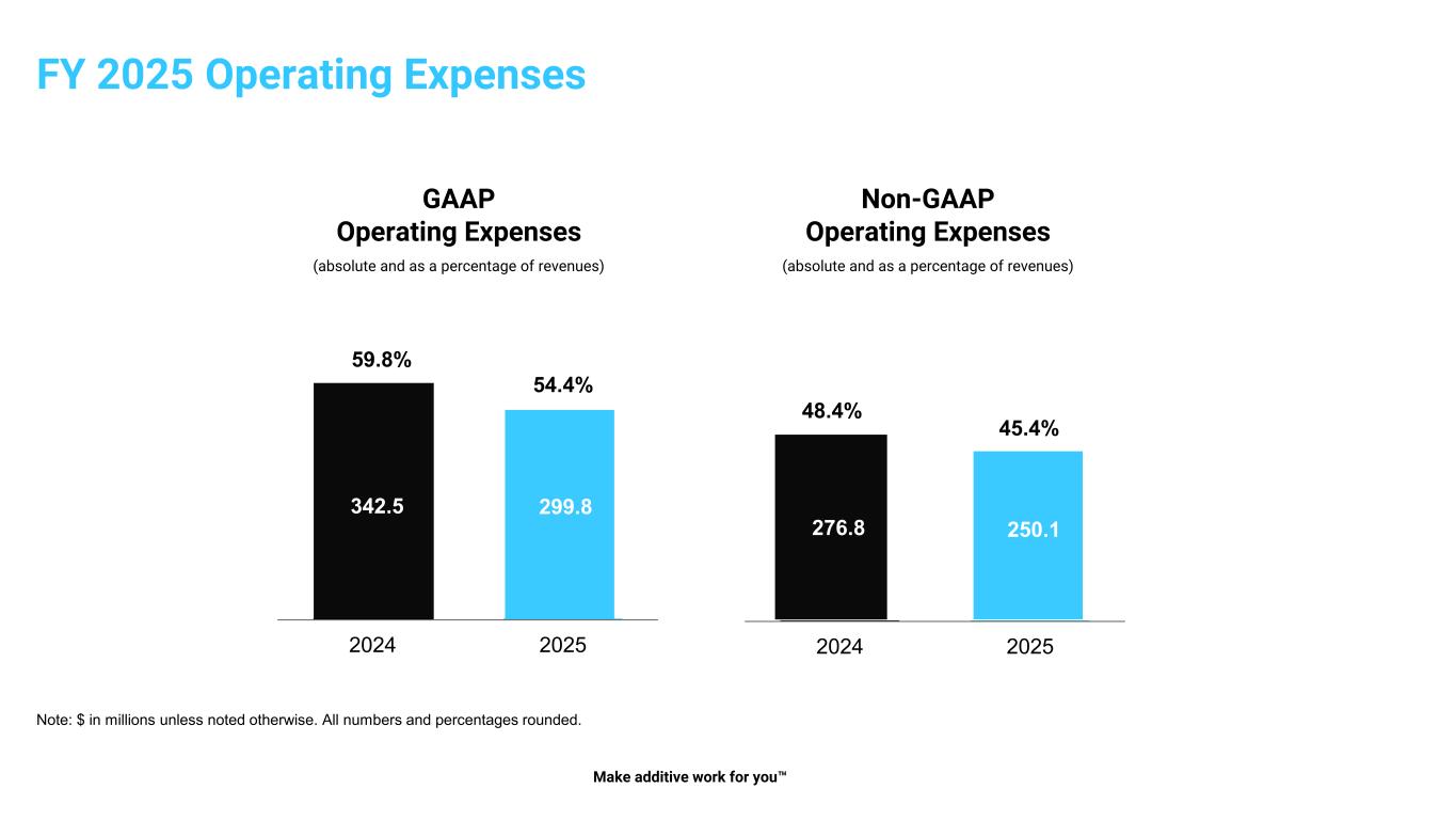 24注:百万美元,除非另有说明,每股金额除外。所有数字和百分比四舍五入。24附录– 2025年至2024年关键指标的比较使添加剂为您发挥作用GAAP非GAAP 20242025变化Y/Y 20242025变化Y/Y总收入572.5551.1-3.7 % 572.5551.1-3.7 %毛利润256.82 27.3(29.5)281.8 258.4(23.4)▪%利润率44.9% 41.2%-3.7 % 49.2% 46.9%-2.3 %营业收入(亏损)(85.7)(72.5)13.24.98.3 3.4▪%利润率-15.0 %-13.2 % 1.8% 0.9% 1.5% 0.6%净收入(亏损)(120.3)(104.3)16.04.21 2.78.5▪%利润率-21.0 %-18.9 % 2.1% 0.7% 2.3% 1.6%摊薄EPS(1.70)(1.28)0.42 0.06 0.15 0.09摊薄股份70.98 1.6 10.77 1.28 2.31 1.1