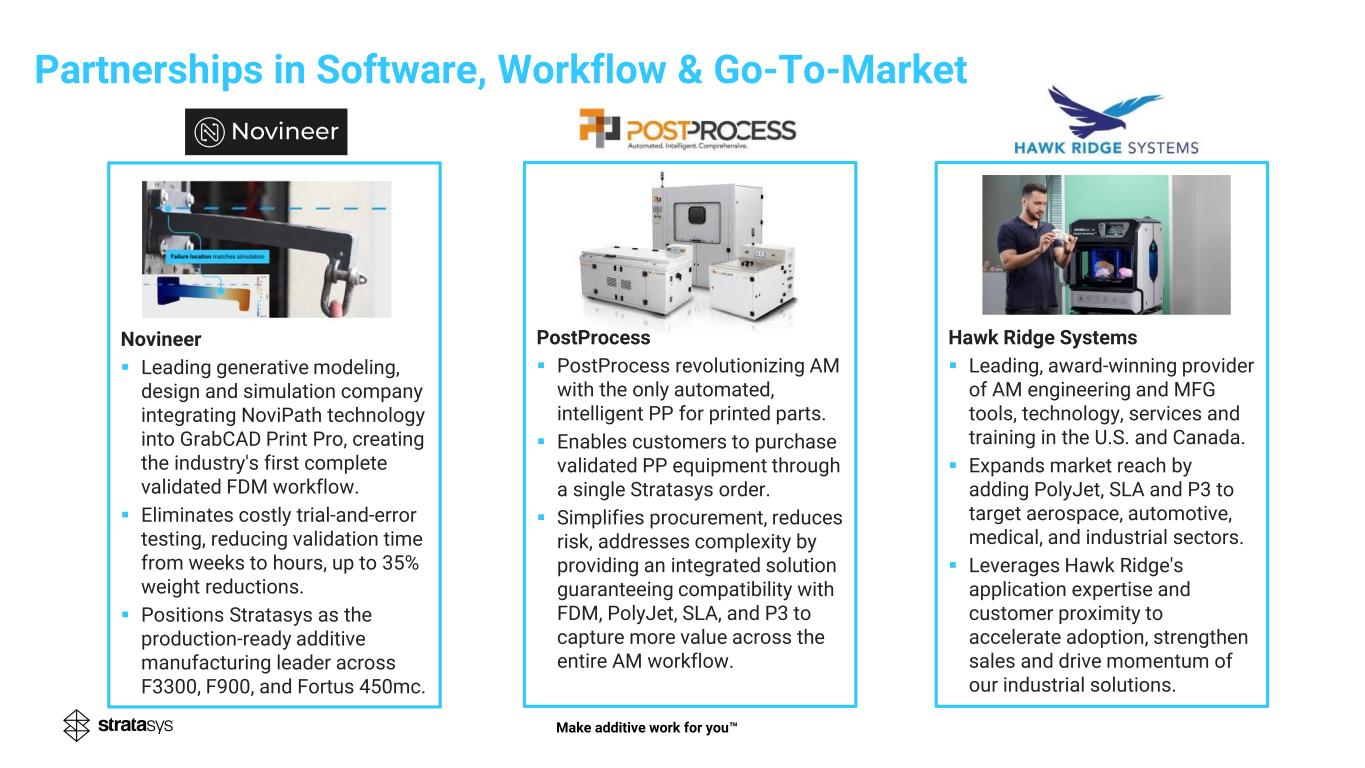 让添加剂为你工作Novineer▪领先的生成建模、设计和仿真公司将NoviPath技术集成到GrabCAD Print Pro中,创建了业界首个完整的经过验证的FDM工作流程。▪消除了成本高昂的试错测试,将验证时间从数周缩短至数小时,最多可减轻35%的重量。▪将斯特塔西定位为横跨F3300、F900、Fortus 450MC的即产增材制造龙头。软件、工作流程和上市后流程方面的合作伙伴关系▪PostProcess革命性AM与打印零件唯一的自动化、智能PP。▪使客户能够通过单个斯特塔西订单购买经过验证的PP设备。▪通过提供一个集成解决方案,保证与FDM、PolyJet、SLA和P3的兼容性,从而在整个AM工作流程中获取更多价值,从而简化采购、降低风险、解决复杂性。霍克岭系统▪美国和加拿大领先、屡获殊荣的AM工程和MFG工具、技术、服务和培训提供商。▪通过增加PolyJet、SLA和P3来扩大市场范围,以航空航天、汽车、医疗和工业领域为目标。▪利用Hawk Ridge的应用专业知识和客户接近性来加速采用、加强销售并推动我们的工业解决方案的势头。