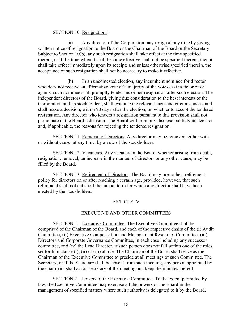 18第10款。辞职。(a)公司任何董事可随时向董事会或董事会主席或秘书发出书面辞职通知而辞职。除第10(b)条另有规定外,任何该等辞呈须在其中指明的时间生效,或如该辞呈的生效时间未在其中指明,则该辞呈须在收到时立即生效;而除非其中另有指明,否则接纳该辞呈无须使其生效。(b)在无争议的选举中,任何现任董事提名人如未获得赞成或反对该被提名人的多数票的赞成票,须在该选举后迅速提出辞呈。董事会独立董事在适当考虑公司及其股东的最佳利益的情况下,对相关事实和情况进行评估,并在当选后90日内对是否接受提交的辞呈作出决定。任何董事根据本规定提出辞呈,不得参与董事会的决定。董事会将及时公开披露其决定以及(如适用)拒绝提交的辞呈的原因。第11节。罢免董事。任何董事均可随时通过股东投票罢免,无论是否有因由。第12节。空缺。董事会的任何空缺,不论是因死亡、辞职、免职、董事人数增加或任何其他原因产生,均可由董事会填补。第13节。董事退休。董事会可为达到一定年龄或之后的董事订明退休政策,但此种退休不得缩短任何董事应由股东选出的年度任期。第四条执行委员会和其他委员会第1款。执行委员会。执行委员会应由董事会主席以及(i)审计委员会、(ii)高管薪酬和管理资源委员会、(iii)董事和企业管治委员会各自的主席组成,在每种情况下包括任何继任委员会,以及(iv)首席董事,前提是该人不属于上文第(i)、(ii)或(iii)条规定的角色之一。董事会主席应担任执行委员会主席,主持该委员会的所有会议。秘书,或如秘书缺席该会议,则由主席委任的任何人,须代行会议秘书的职责,并备存会议纪录。第2节。执行委员会的权力。在法律许可的范围内,执行委员会可行使管理局在管理特定事项方面的所有权力,而该等权力是由管理局授予的,