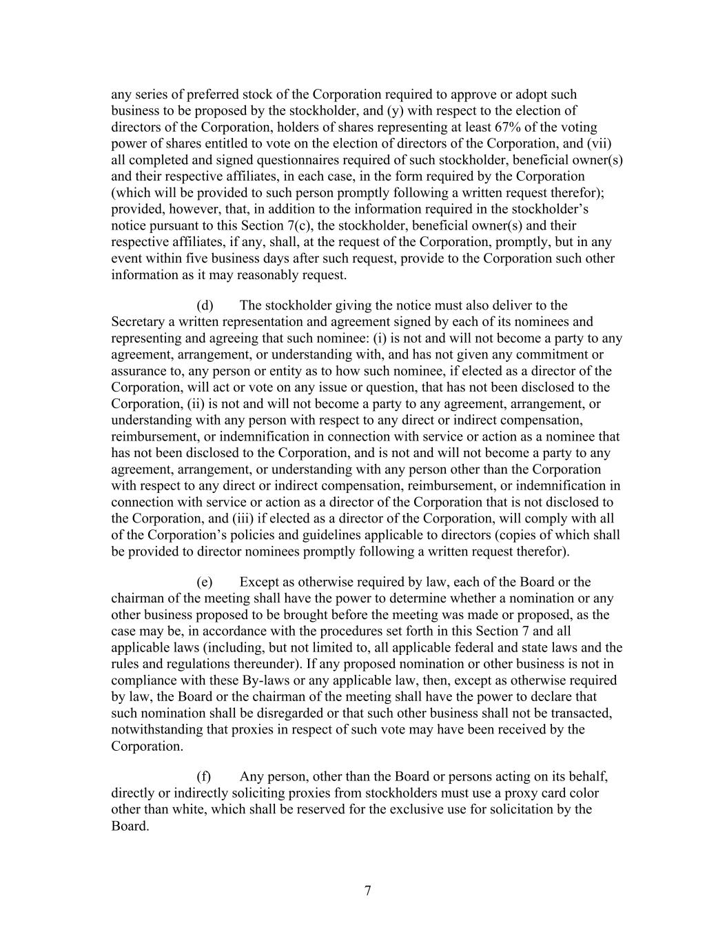 7为批准或采纳由股东提出的该等业务所需的公司任何系列优先股,以及(y)就选举公司董事而言,代表至少67%有权就公司董事选举投票的股份投票权的股份持有人,以及(vii)该等股东、实益拥有人及其各自关联公司所需的所有填妥和签署的问卷,在每种情况下,均采用公司要求的格式(将在提出书面要求后立即提供给该人);但,然而,除根据本条第7(c)款在股东通知中要求的信息外,股东、实益拥有人及其各自的关联公司(如有)应公司的请求,应迅速但无论如何在该请求后五个工作日内,向公司提供其可能合理要求的其他信息。(d)发出该通知的股东还必须向秘书交付由其每一名被提名人签署的书面陈述和协议,并代表并同意该被提名人:(i)不是也不会成为与任何个人或实体的任何协议、安排或谅解的一方,也没有对任何个人或实体作出任何承诺或保证,说明该被提名人如当选为公司董事,将如何就未向公司披露的任何问题或问题采取行动或投票,(ii)就与作为代名人的服务或行动有关的任何直接或间接补偿、补偿或弥偿而与任何人订立的任何协议、安排或谅解,而该等协议、安排或谅解并无向公司披露,而就与作为公司董事的服务或行动有关的任何直接或间接补偿、补偿或弥偿,该等协议、安排或谅解并无亦不会成为与公司以外的任何人订立的任何协议、安排或谅解的订约、安排或谅解的订约、安排或谅解的订约、安排或谅解的订约、安排或谅解的订约或谅解的订约、安排或谅解的订约或谅解的订约、补偿或谅解的订约或谅解的订约、补偿或谅解的订及(iii)如当选为公司董事,将遵守公司适用于董事的所有政策及指引(其副本须在提出书面要求后立即提供予董事提名人)。(e)除法律另有规定外,委员会或会议主席各自均有权根据本条第7条及所有适用法律(包括但不限于所有适用的联邦和州法律及其下的规则和条例)规定的程序,决定提名或拟提交会议的任何其他事务(视属何情况而定)是否已作出或拟作出。如任何建议的提名或其他业务不符合本附例或任何适用法律的规定,则除法律另有规定外,董事会或会议主席有权宣布该等提名将不予考虑或不得处理该等其他业务,尽管有关该投票的代理人可能已由公司接获。(f)除董事会或代表其行事的人外,任何人直接或间接向股东征集代理,必须使用白色以外的代理卡颜色,该颜色应留作董事会征集专用。
