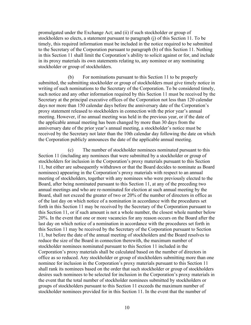 10根据《交易法》颁布;(ii)如果此类股东或股东群体如此选择,则根据本第11条(j)款作出声明。为了及时,这些所需资料必须包括在根据本条第11款(b)段要求提交公司秘书的通知中。第11条的任何规定均不得限制公司征求反对或支持的能力,并在其代理材料中包括其与任何代名人或任何提名股东或股东集团有关的陈述。(b)为使依据本条第11条的提名得以妥善提交,提交股东或股东集团必须将该等提名及时以书面通知公司秘书。为被视为及时,此种通知和第11条所要求的任何其他信息必须由秘书在公司就上一年度年会向股东发布的代理声明的周年日期之前不少于120个历日或不超过150个历日在公司的主要执行办公室收到。然而,如果上一年没有举行年会,或适用年会的日期较上一年年会的周年日有超过30天的变动,则秘书必须在不迟于公司公开宣布适用年会日期后的第10个日历日收到股东的通知。(c)根据第11条获提名的股东代名人(包括由一名股东或一组股东根据第11条提交以列入公司代理材料,但随后被撤回或董事会决定提名为董事会代名人的任何代名人)在公司关于股东年会的代理材料中出现的人数,以及根据第11条获提名后先前当选为董事会成员的任何代名人,在前两次年会中的任何一次会议上,如获董事会重新提名在该年会上选举,则不得超过公司秘书依据第11条可能收到按照第11条所列程序的提名通知的最后一天在任董事人数的两名或20%中的较大者,或如该数额不是整数,则以低于20%的最接近整数。如公司秘书依据第11条可收到按照第11条所列程序作出提名的通知的最后一天后,董事会出现一个或多个因任何理由出现的空缺,但在股东周年大会日期之前,且董事会决议减少与此有关的董事会规模,公司代理材料中包含的根据第11条提名的股东被提名人的最大数量应根据如此减少的在任董事人数计算。任何股东或股东集团根据第11条提交一个以上的被提名人以列入公司的代理材料,在股东或股东集团根据第11条提交的股东被提名人总数超过第11条规定的股东被提名人的最大数量的情况下,应根据该股东或股东集团希望这些被提名人被选中以列入公司的代理材料的顺序对其被提名人进行排名。如果发生数