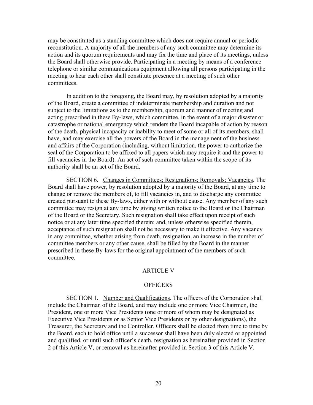 20可组成不需要每年或定期改组的常设委员会。任何该等委员会的全体成员的过半数可决定其行动及其法定人数规定,并可订定其会议的时间及地点,但委员会另有规定的除外。使用会议电话或类似通信设备参加会议,使参加会议的所有人能够相互听取意见,应构成出席该等其他委员会的会议。除上述情况外,管理局可藉经管理局过半数通过的决议,设立一个成员及会期不定的委员会,而该委员会不受本附例所订明的成员、法定人数及开会及行事方式的限制所规限。如发生重大灾害或灾难或国家紧急情况,导致管理局因部分或全部成员死亡、身体无行为能力或无法开会而无法采取行动,则该委员会须具备,及可行使管理局在管理公司业务及事务方面的所有权力(包括但不限于授权在所有可能需要其盖章的文件上加盖公司印章的权力及填补管理局空缺的权力)。该委员会在其权限范围内采取的行为,即为董事会行为。第6节。委员会变动;辞职;免职;出缺。委员会有权在任何时间藉经委员会过半数通过的决议,更改或罢免根据本附例成立的任何委员会的成员、填补空缺,以及解除根据本附例成立的任何委员会的职务,不论是否有因由。任何该等委员会的任何成员可随时向管理局或管理局主席或秘书发出书面通知而辞职。该辞职应在收到该通知时或在通知中指明的任何较后时间生效;除通知中另有规定外,接受该辞职无须使其生效。任何委员会的任何空缺,不论是因死亡、辞职、委员会成员人数增加或任何其他原因而产生,均须由管理局按本附例就该委员会原委任的成员订明的方式填补。第五条主席团第1款。数量和资格。公司的高级人员应包括董事会主席,并可包括一名或多名副主席、总裁、一名或多名副总裁(其中一名或多名可被指定为执行副总裁或高级副总裁或通过其他指定)、财务主管、秘书和财务总监。主席团成员应由理事会不时选举产生,每人任期至继任人正式当选或获委任并符合资格为止,或至该继任人去世、本条第五条第二款下文规定的辞职或本条第五款下文规定的免职为止。