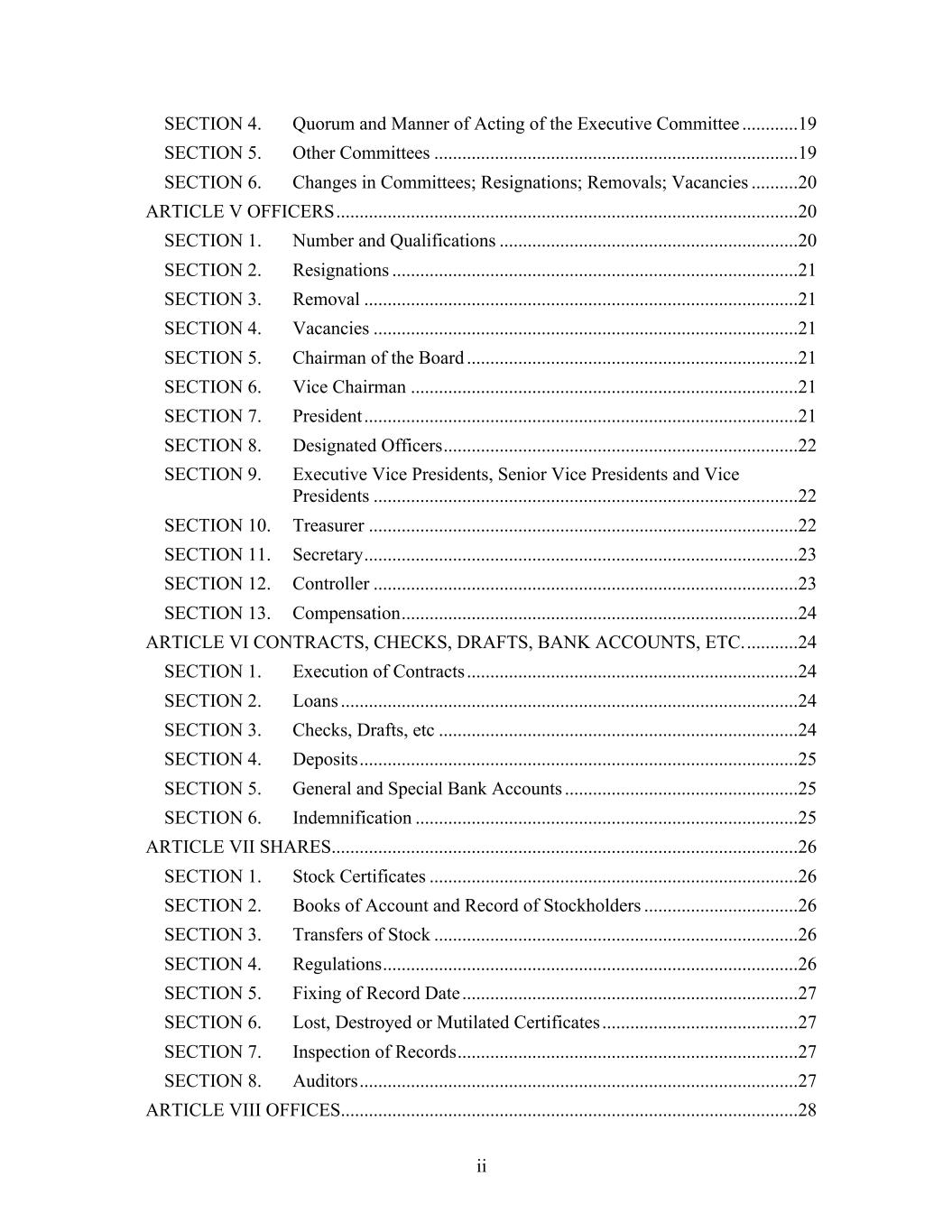 二、第4节。执行委员会的法定人数和行事方式.................... 19第5节。其他委员会.................................................................................... 19第六节。委员会变动;辞职;免职;出缺....................20第五条主席团成员...................................................................................................20第一节。人数和任职资格...................................................................20第二节。辞职................................................................................21第三节。移除.....................................................................................21第四节。空缺...................................................................................21第五节。董事长....................................................................21第六节。副董事长...................................................................................21第七节。会长.....................................................................................21第八节。指定人员.................................................................................... 22第9节。执行副总裁、高级副总裁和副总裁.................................................................................... 22第10款。司库.................................................................................... 22第11条。秘书.....................................................................................23第十二节。控制人...................................................................................23第十三节。赔偿.....................................................................................24第六条合同、支票、汇票、银行账户等。...................24第一节。合同的执行...................................................................................24第二节。贷款..................................................................................................24第三节。支票、汇票等.....................................................................................24第四节。存款......................................................................................25第5节。一般和专用银行账户....................................................25第6款。赔偿..................................................................................25第七条份额......................................................................................................26第一节。股票凭证...................................................................................26第二节。股东的账簿和记录.................................26第三节。股票的转让......................................................................................26第四节。条例.....................................................................................26第五节。确定记录日期......................................................................................27第六节。遗失、毁损或残缺的证明..................................................27第7款。查阅记录.................................................................................27第八节。审计员......................................................................................27第八条办公室....................................................................................................28