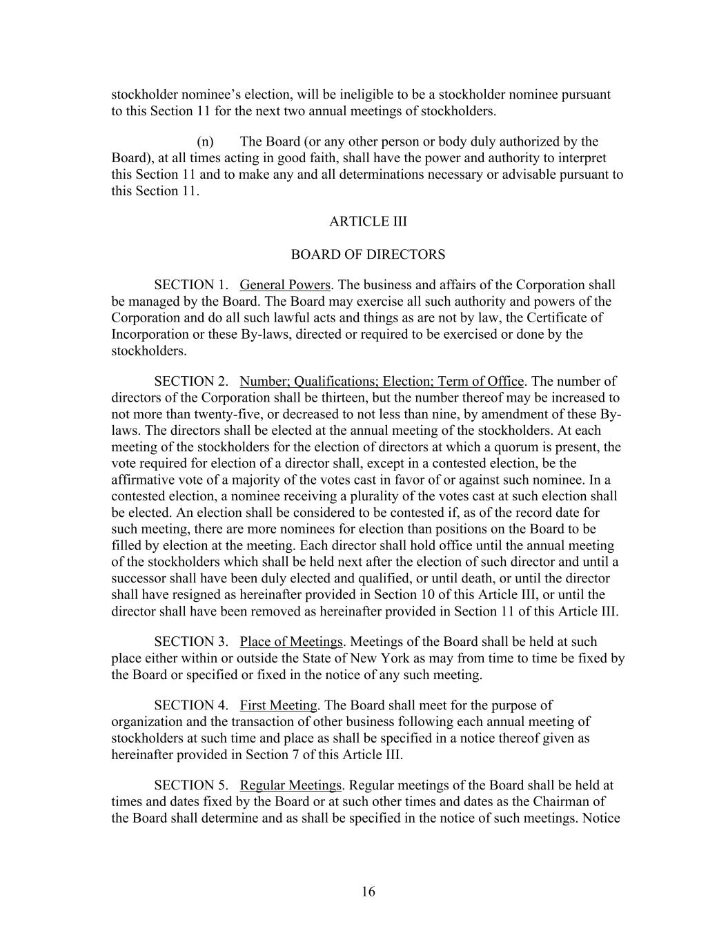 16名股东提名人的选举,将没有资格根据本第11条成为未来两届股东年会的股东提名人。(n)委员会(或委员会妥为授权的任何其他人或团体)在任何时候均本着诚意行事,有权及有权解释第11条,并依据第11条作出任何及所有必要或可取的决定。第三条董事会第一节。一般权力。公司的业务和事务由董事会管理。董事会可行使公司的所有权力及权力,并作出并非法律、法团证明书或本附例所指示或规定由股东行使或作出的所有合法作为及事情。第2节。数;任职资格;选举;任期。公司董事人数为十三人,但可藉修订本附例将董事人数增至不多于二十五人,或减至不少于九人。董事应在年度股东大会上选举产生。在每次达到法定人数的选举董事的股东大会上,除有争议的选举外,选举董事所需的表决票应为赞成或反对该被提名人的多数票的赞成票。在有争议的选举中,应选出在该选举中获得多数票的被提名人。如在该次会议的记录日期,获提名参选的候选人多于董事会须在该次会议上以选举方式填补的职位,则该次选举须视为有争议。每名董事的任期至该董事当选后下一次召开的股东年会并直至一名继任人已妥为选出并符合资格为止,或至去世为止,或至该名董事按本条第三条第10款下文规定辞职为止,或至该名董事按本条第三条第11款下文规定被免职为止。第3节。会议地点。董事会会议应在纽约州境内或境外不时由董事会确定或在任何此类会议通知中指明或确定的地点举行。第4节。第一次见面。董事会应在下文第三条第七节规定的股东年会通知中规定的时间和地点,在每一次股东年会之后召开组织会议和其他事务的交易。第5节。定期会议。董事会定期会议应在董事会确定的时间和日期举行,或在董事会主席确定并在该等会议通知中指明的其他时间和日期举行。通知
